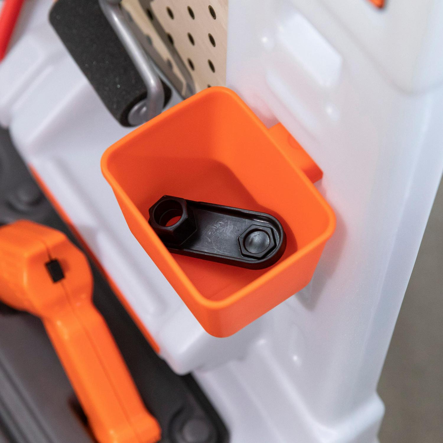 – Tons of storage space included with the pegboards, large storage bin, hanging bins, and cabinet.