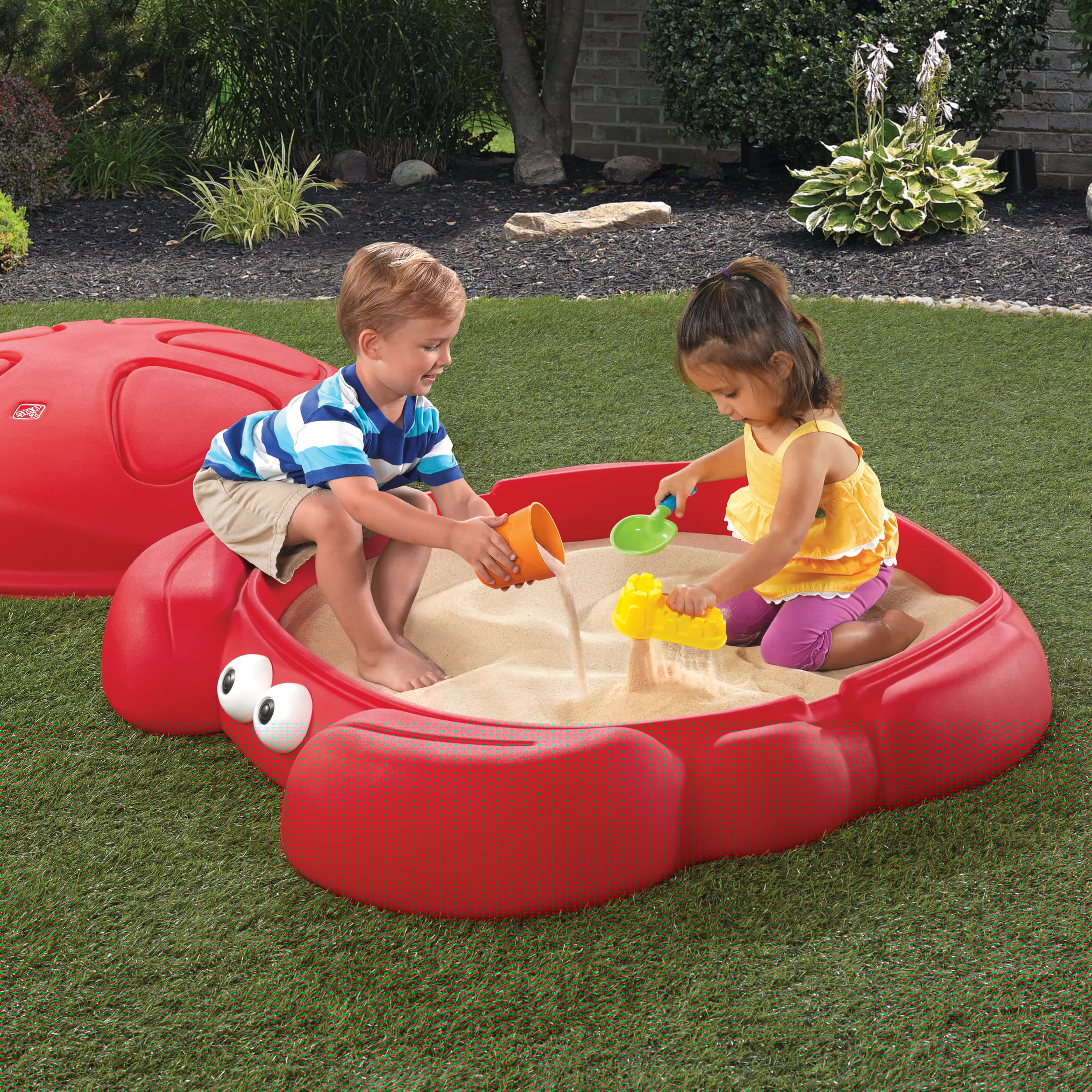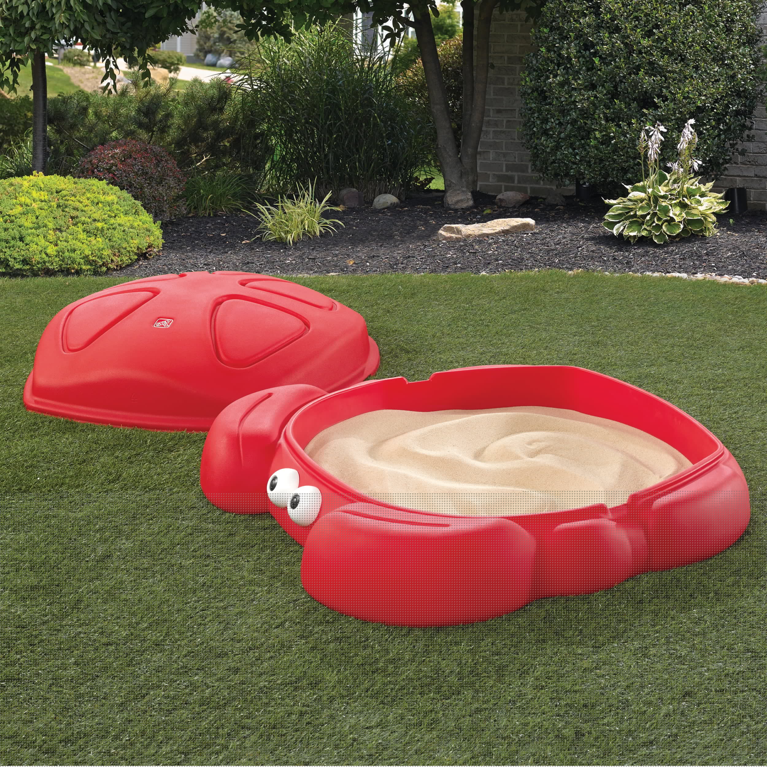 Step2 Crabbie Sandbox Red Plastic Outdoor Sandbox with Cover for Kids