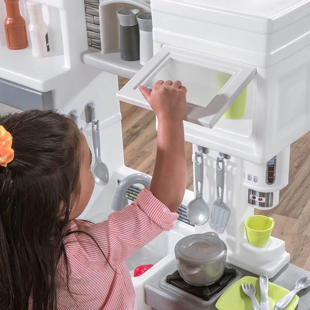 If your little one is eager to help out in the kitchen or always cuddle up against you when you’re watching Top Chef, they will love the Step2 Downtown Delights Pretend Play Toy Kitchen Set.Full of stylish details like the faux granite counter top, gooseneck faucet, and subway tile backsplash behind the sink, your kiddo can enjoy the functionalities of a grown-up kitchen in their size.Your aspiring chef will be able to whip up delicious culinary masterpieces that even Padma Lakshmi will love with this Step2 kitchen set.