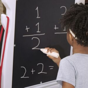 – Double-sided kid’s art easel features a large dry-erase white board and spacious chalk board