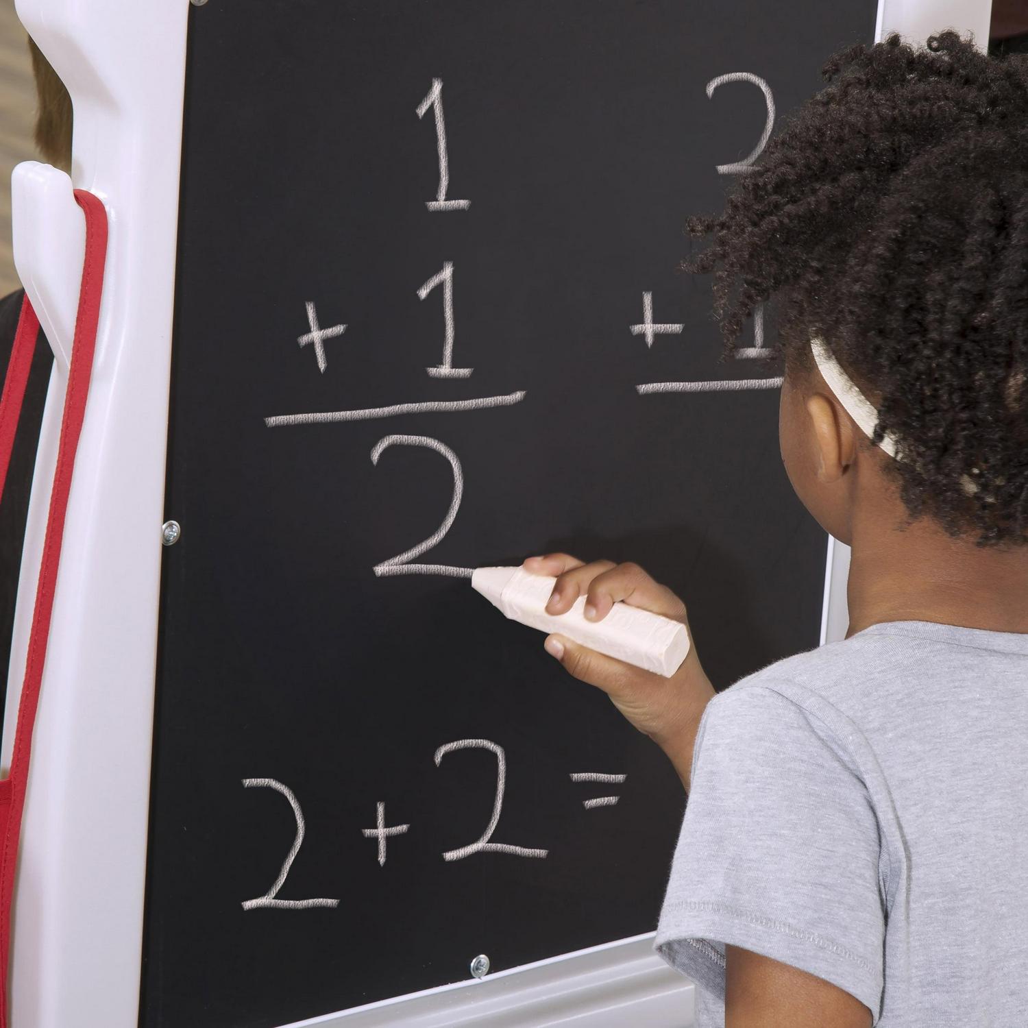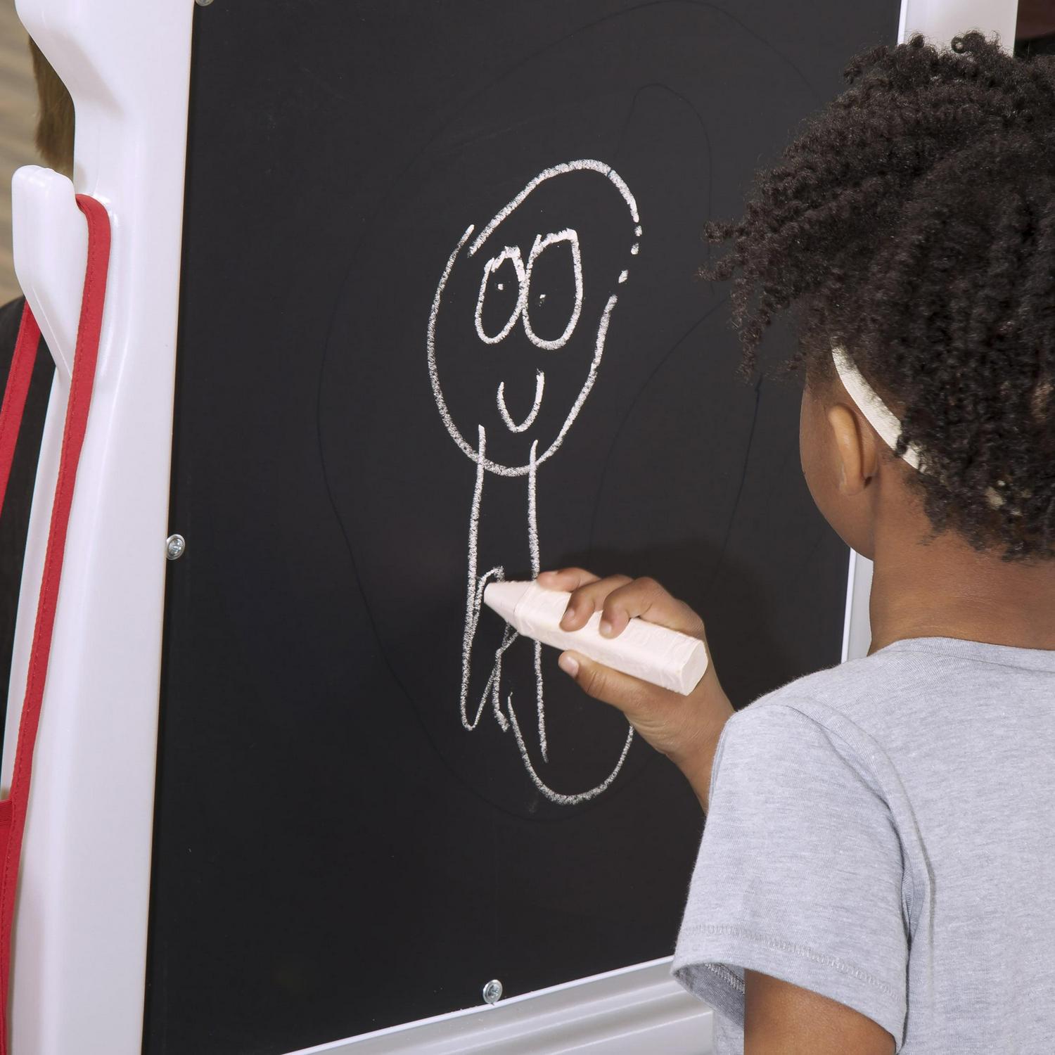- Double-sided kid’s art easel features a large dry-erase white board and spacious chalk board