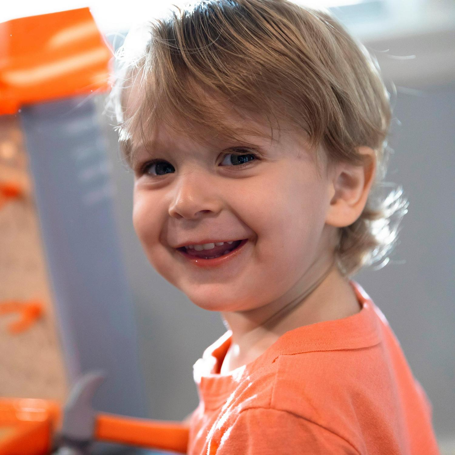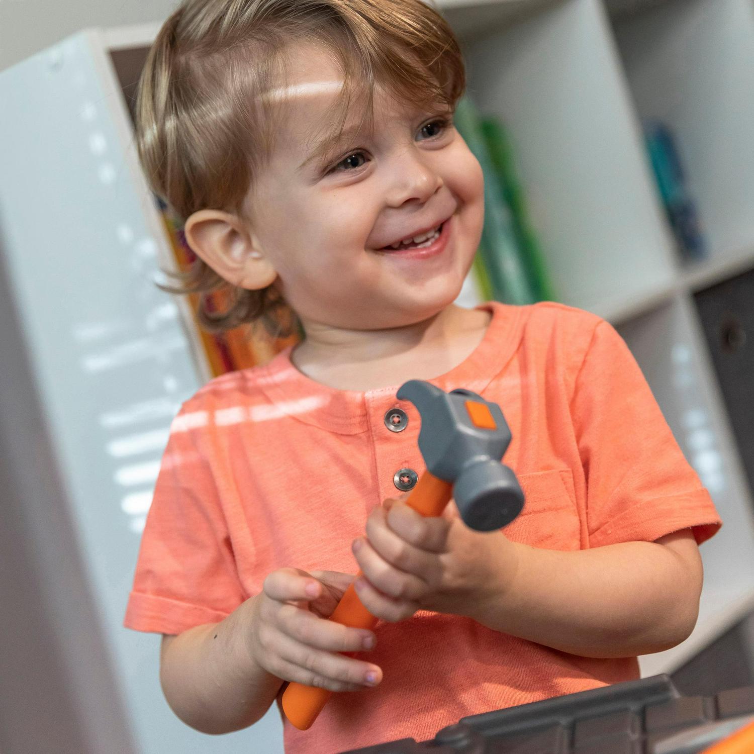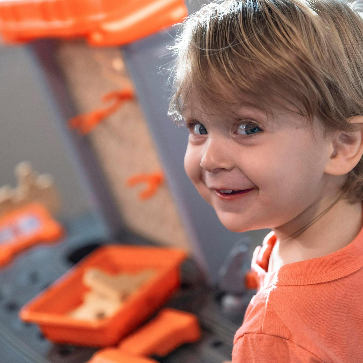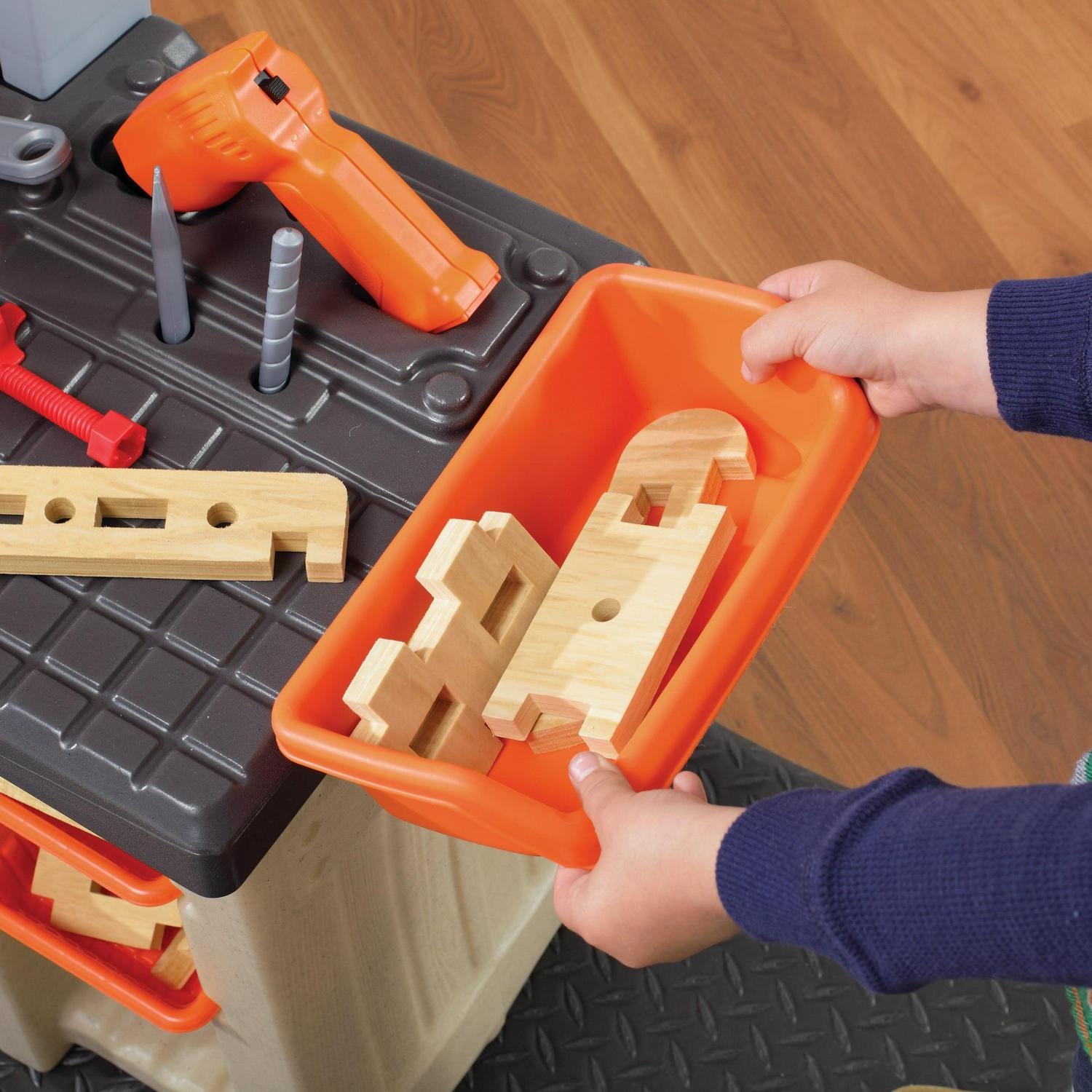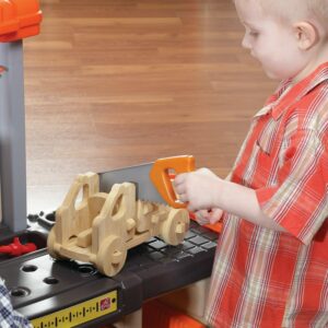 – Large tool bench features a spacious worktop surface for multiple children to build and design!