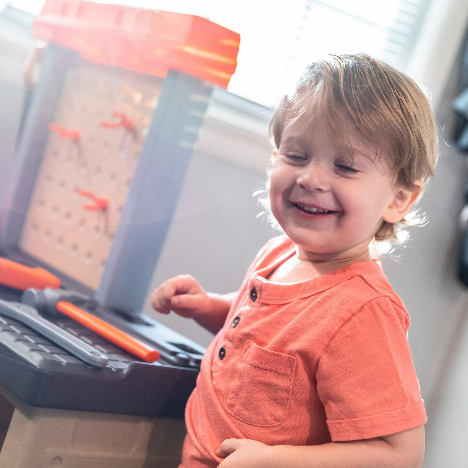 - When playtime is over, hang your tools on the peg board or store them in the storage bins (included)