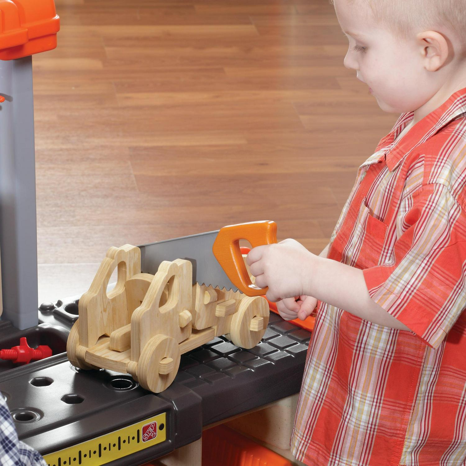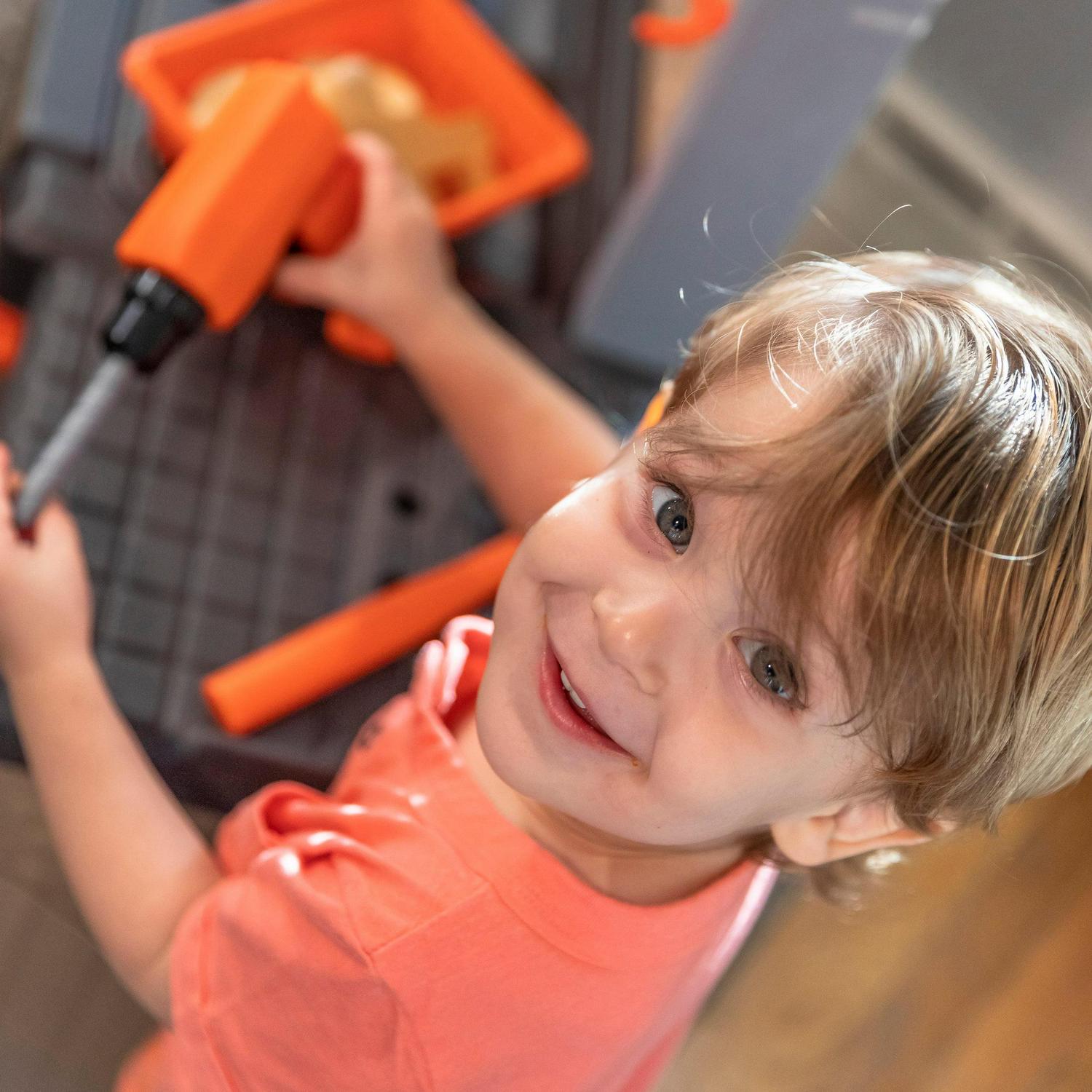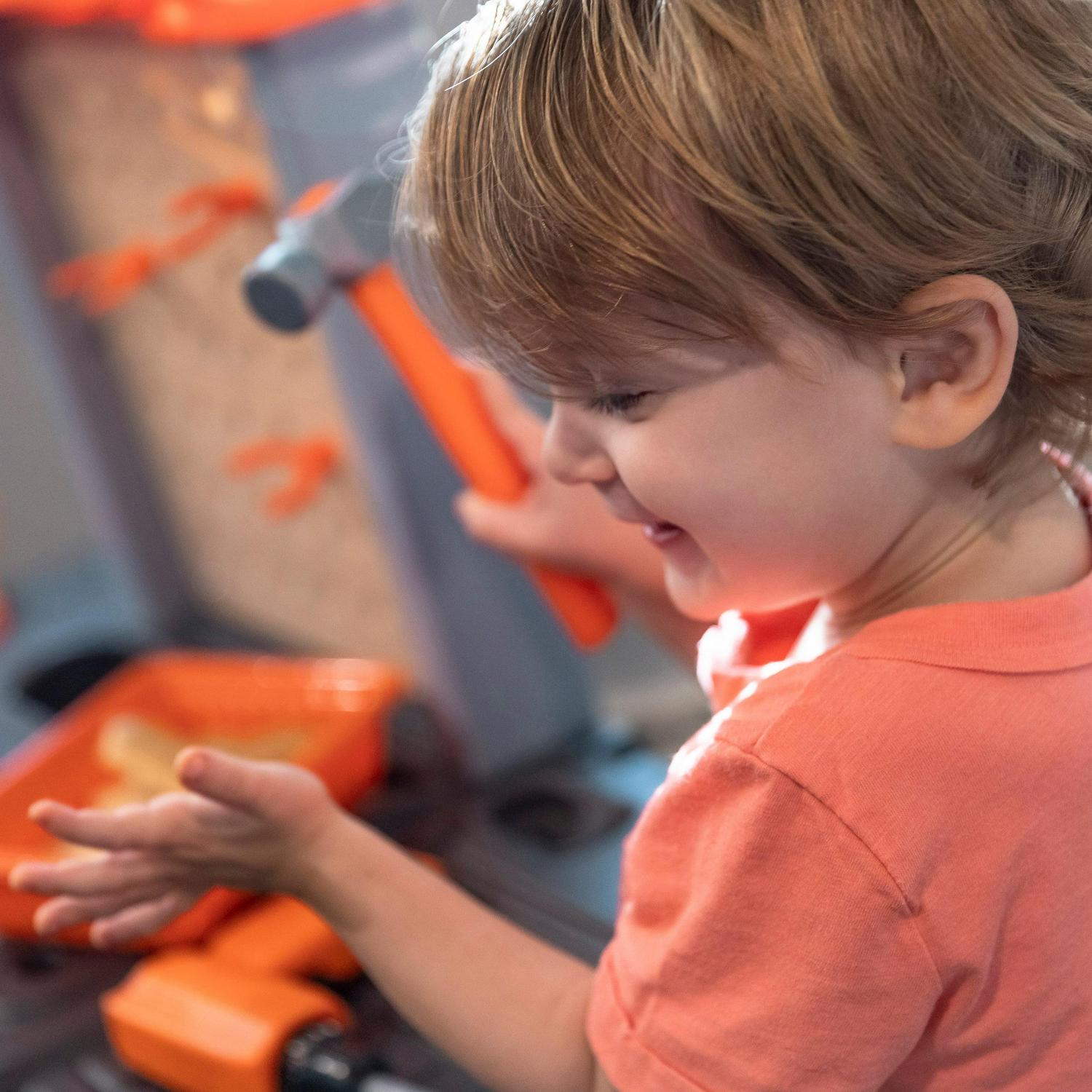 - Large tool bench features a spacious worktop surface for multiple children to build and design!