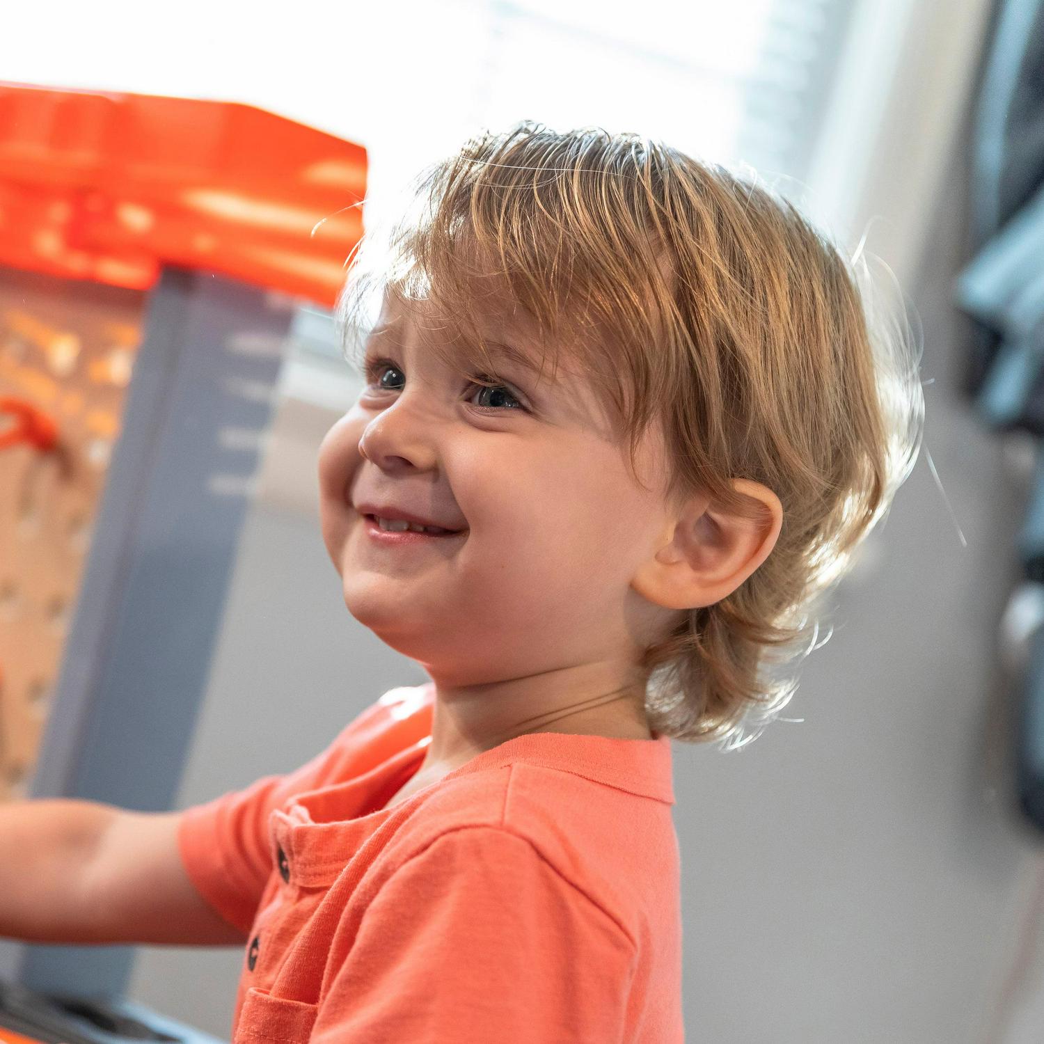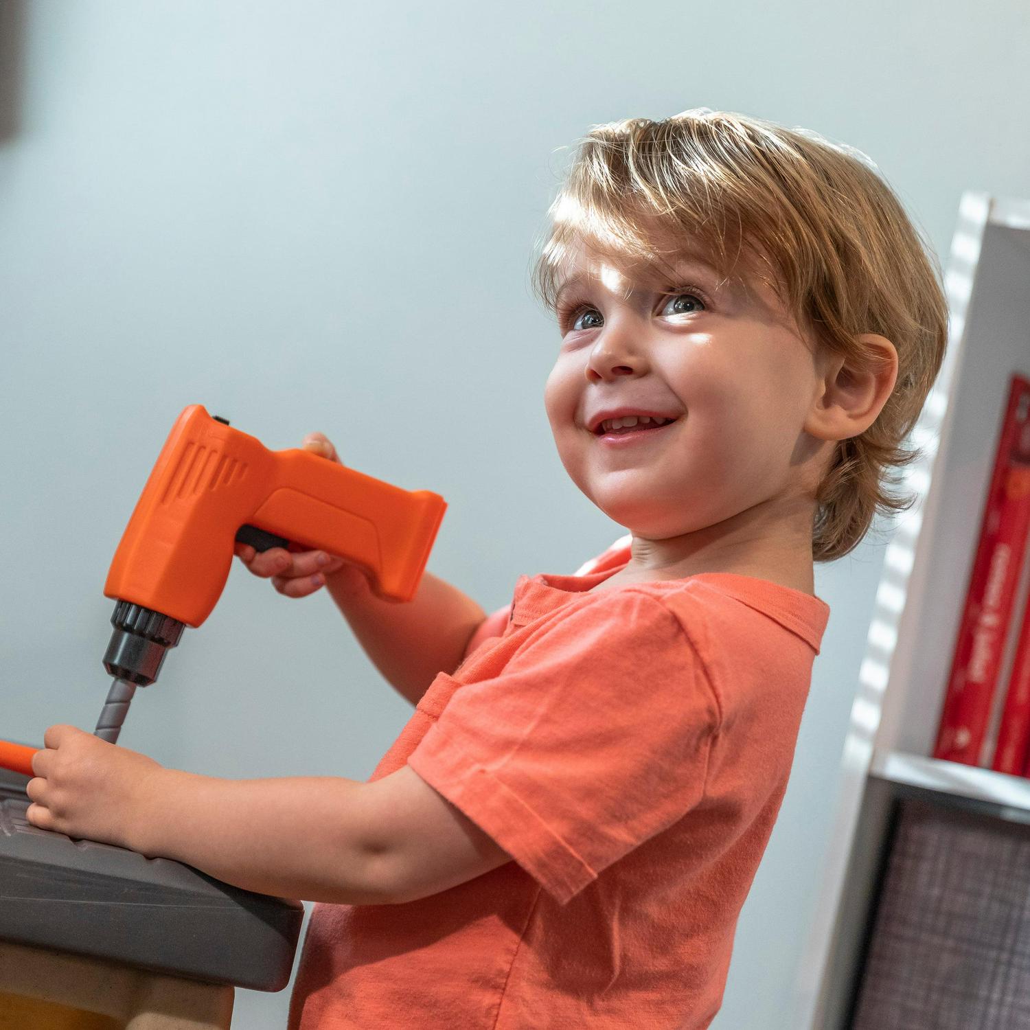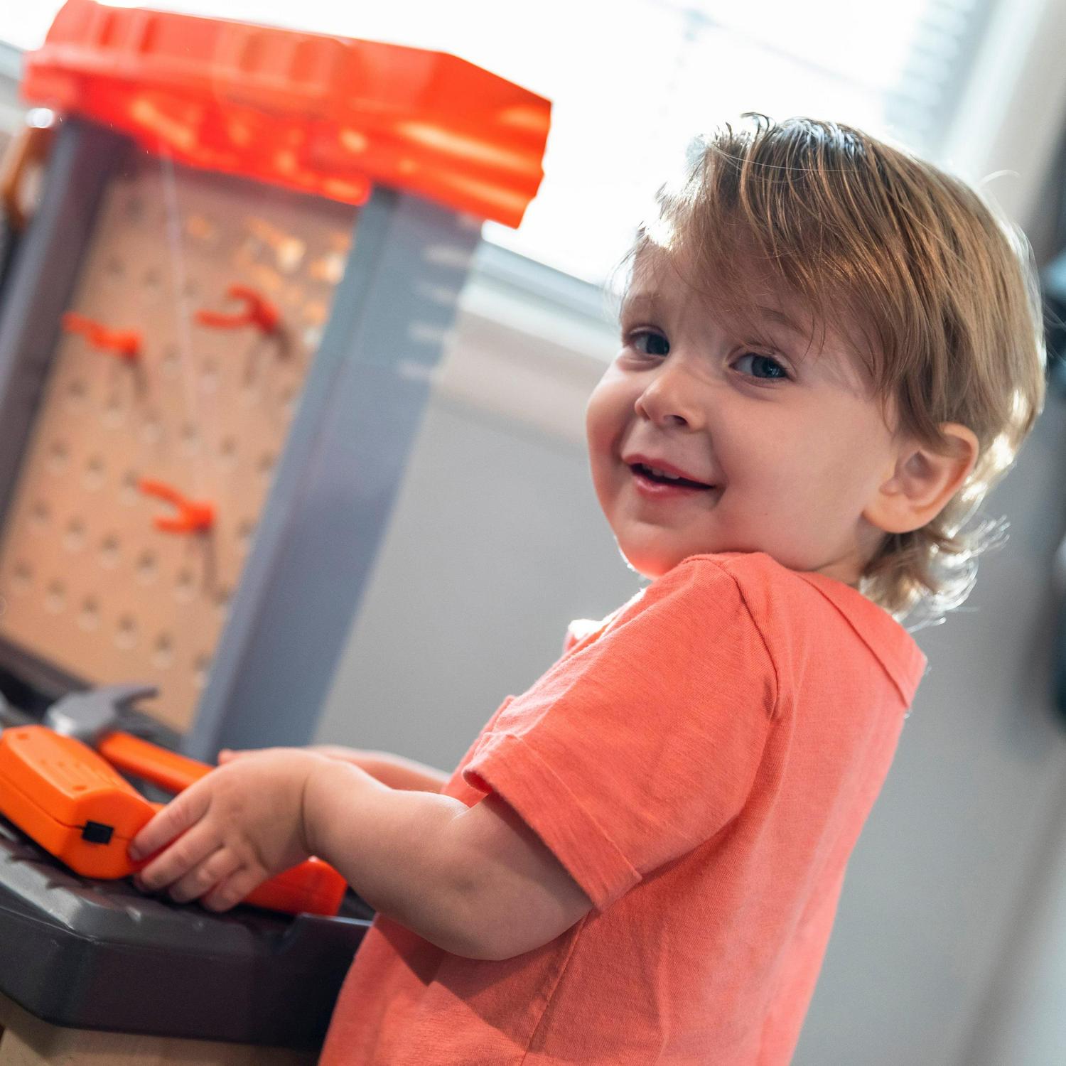 - Large tool bench features a spacious worktop surface for multiple children to build and design!