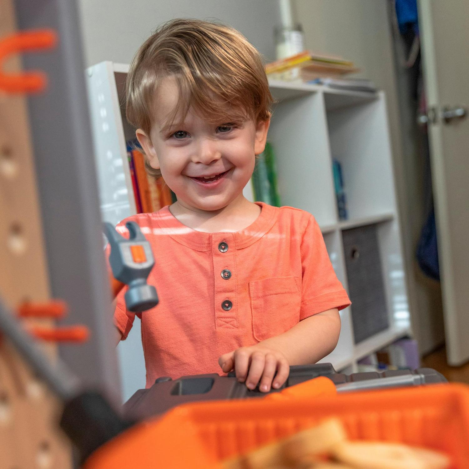– When playtime is over, hang your tools on the peg board or store them in the storage bins (included)