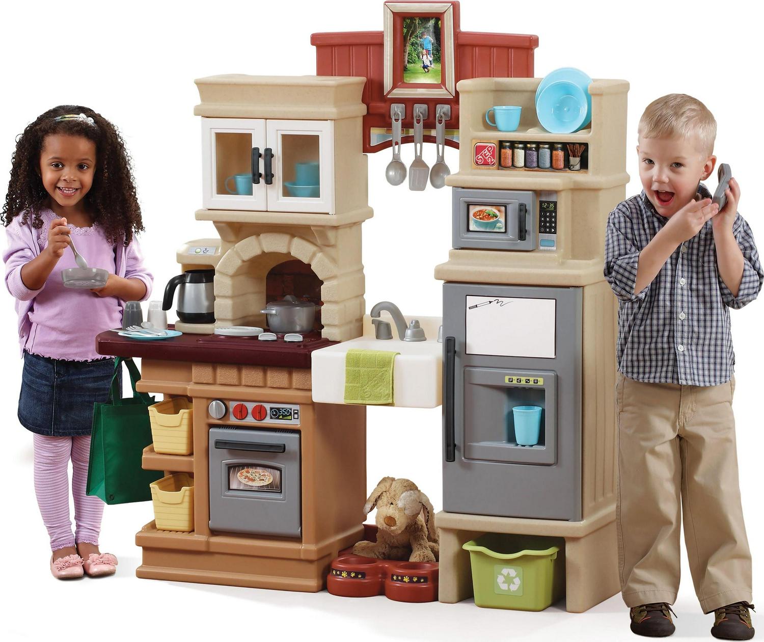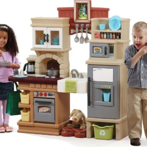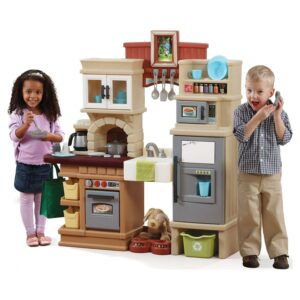Let kid’s imaginations run wild with the Step 2 Heart of the Home Kitchen. This lifelike playset is designed to look just like a new modern kitchen. It has translucent cupboard doors and an imaginary full-size refrigerator, oven and stove made to look just like stainless steel. The deep farmhouse sink looks like the real thing, while the reusable grocery bag is just like the one at home. The Heart of the Home kitchen play set comes with a 41-piece accessory set, so children can pretend to make full meals. There’s even a pet nurturing center. The stovetop makes bubbling noises for a realistic feel as kids cook. There is also a frame where the kids can put their own family photos. Lastly, this kids kitchen comes with a limited 2-year warranty.