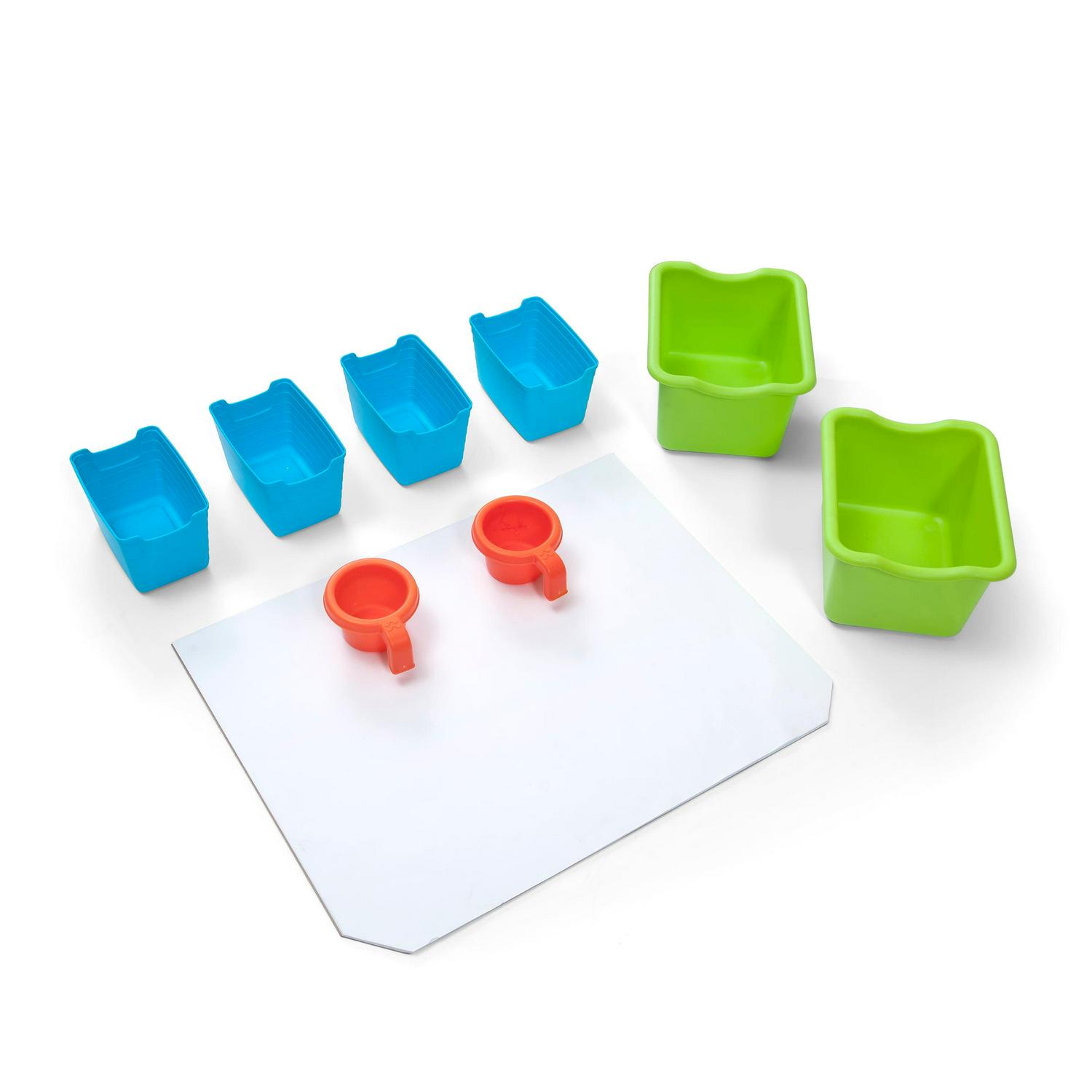 – In the box: Easel base, two-sided art board, 4 small bins, 2 large bins, and 2 cups.