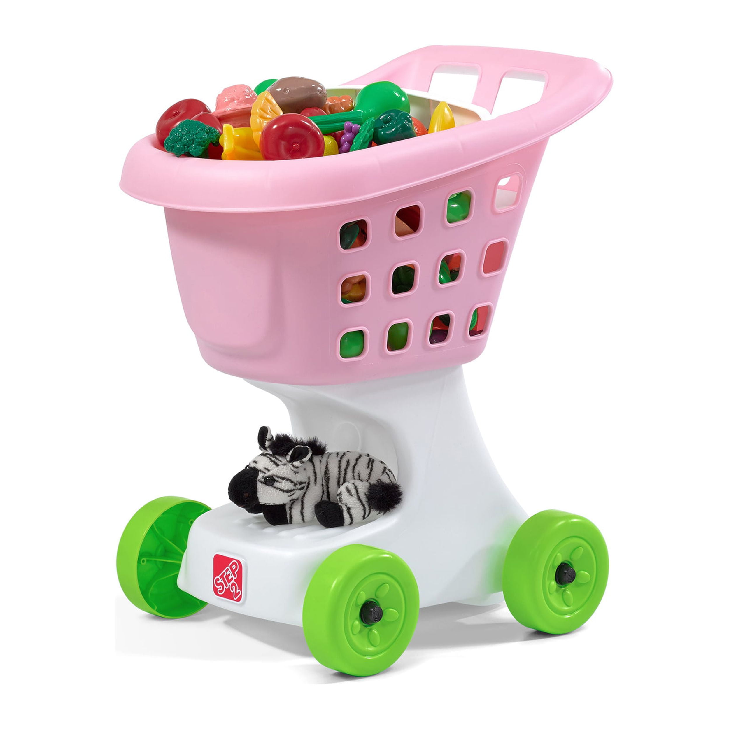 Classic Step2 shopping cart styling mimics real grocery carts adult role models use at the store. Vibrant colored toy shopping cart has a large basket for tons of shopping treasures! Lightweight design, large handles, and smooth molded wheels let toddlers push this grocery cart easily. Bonus space below the basket can store more pretend purchases! Toddlers can take their favorite stuffed animal friend along for the ride in the shopping cart’s doll seat. Easy to clean! Use disinfectant wipes or household cleaners whenever you want! In the box: Shopping cart base and basket, wheels, and doll seat.