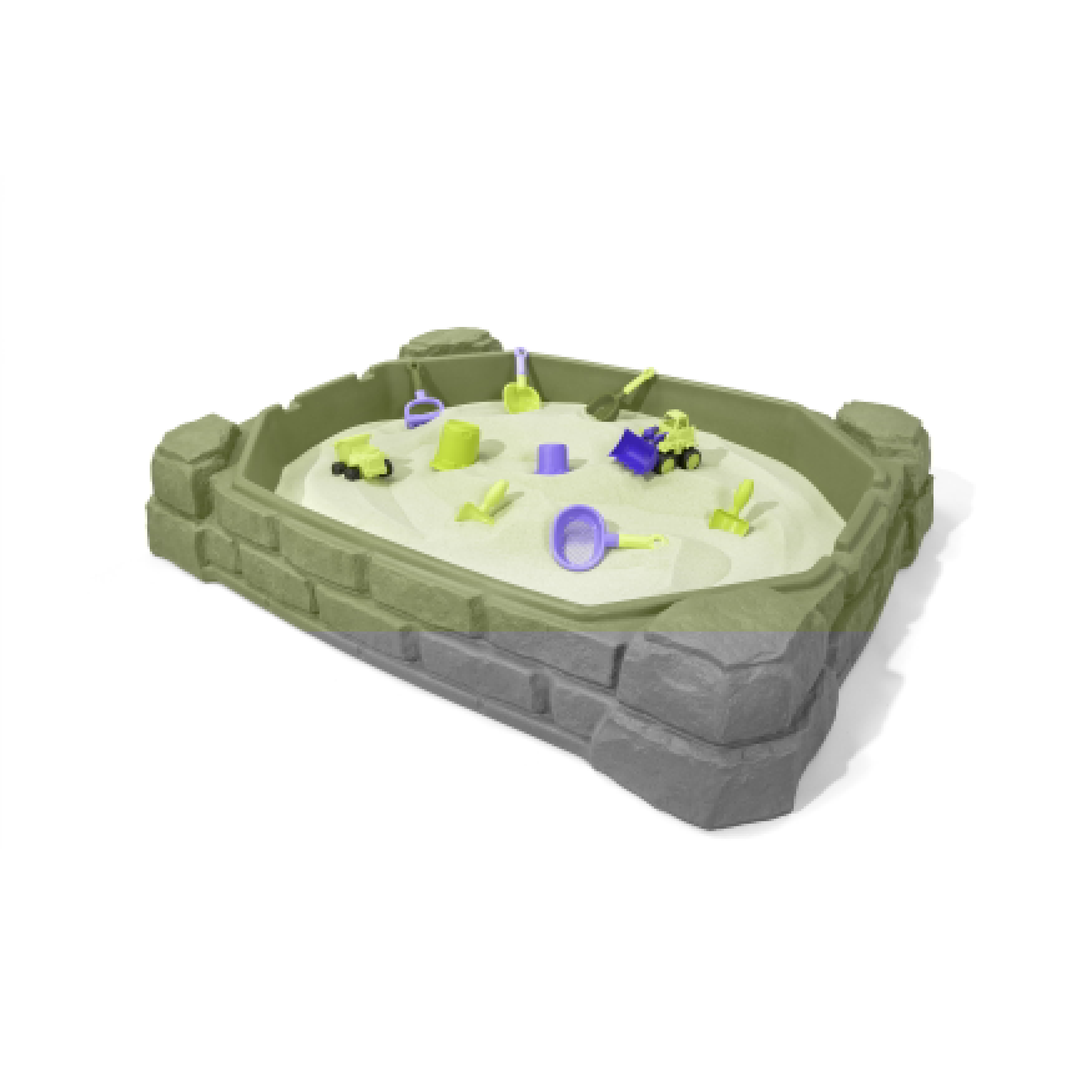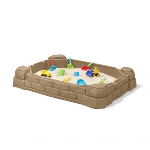 The Step2 Naturally Playful Sandbox in Sandstone Beige is attractive and durable, combining outdoor textures and natural colors to blend in with any backyard. This kids sandbox with cover protects the sand from getting wet on those rainy days, but also allows your toddlers sand toys to be stored inside the sandbox so sand isn t brought into the house. This outdoor toddler sandbox is large enough for four kiddos and the sand capacity is up to 200 lb. The Naturally Playful Sandbox is made of plastic but designed to look like real stone bricks and comes fully assembled! This way you can unpack the sandbox, add sand (sand not included) and then let your little girl or boy get to playing immediately. Lastly, this is a Step2 product which means it comes with a 2 year limited warranty which lets mom and dad know this product is built to last for years to come!