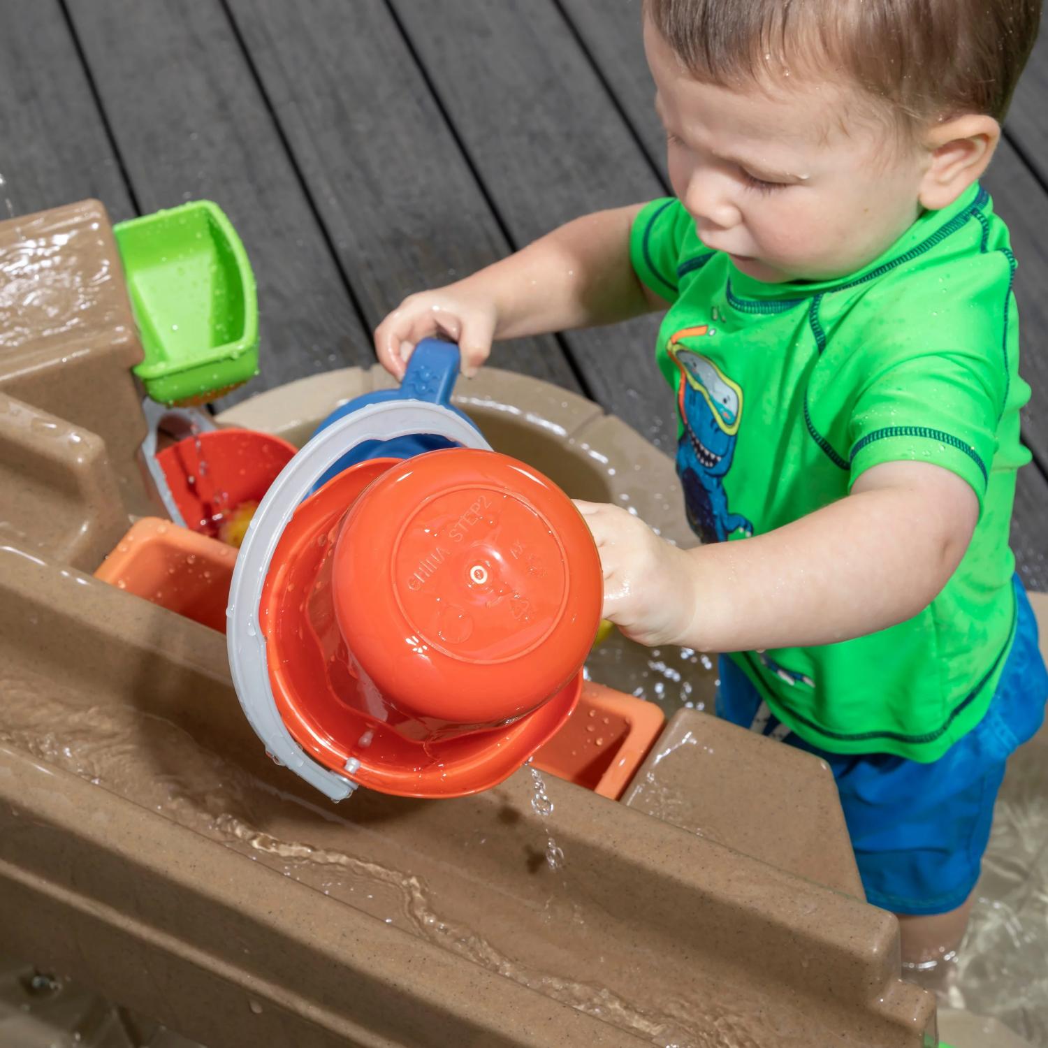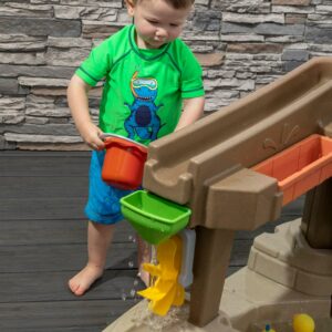 – Swiveling water pump activates three areas of water play: down a channel to a funnel, spinner, and lazy river; a waterfall rain showers effect tray, and into a fill-and-spill bucket.