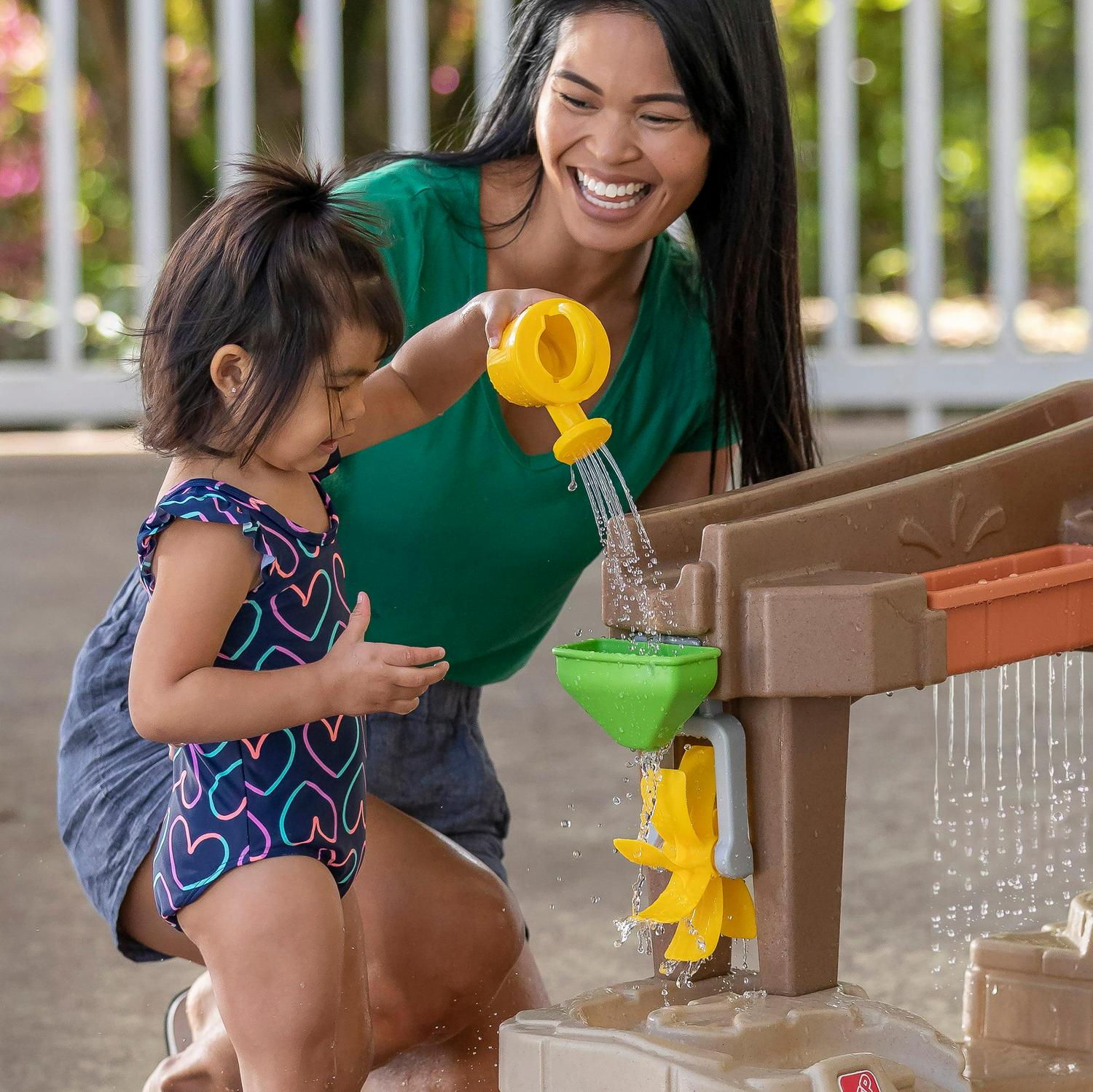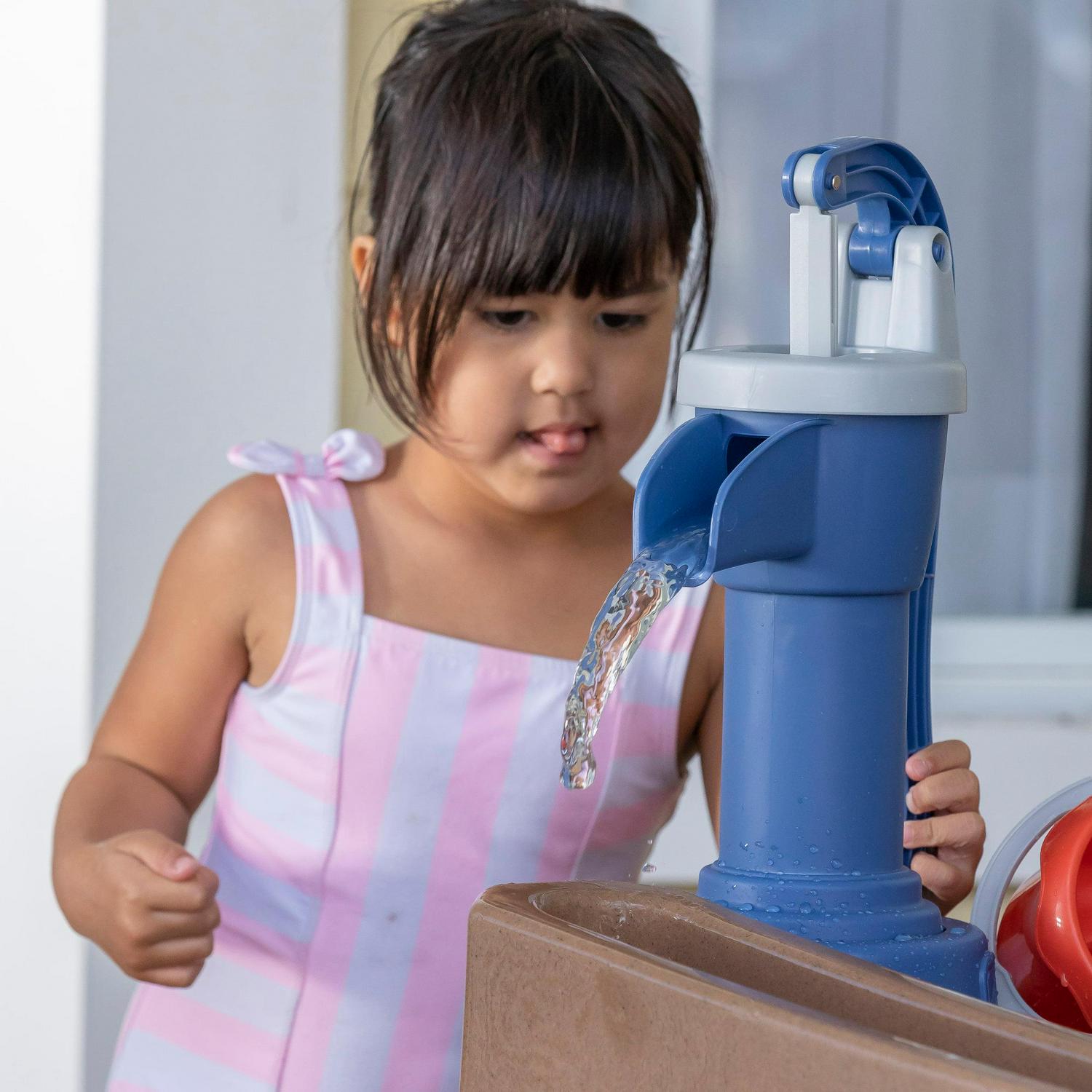 – Kids can create their own water play fun with the child-activated water pump in their very own water garden!
