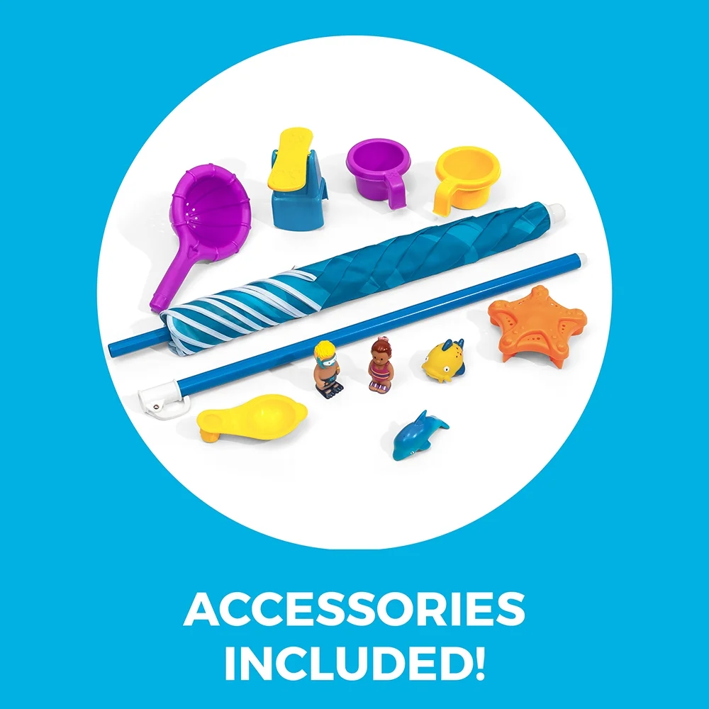 This multi-level kids water table is perfect for outdoor sensory play! Fill the top activity pool and the lower water table, then send the swimmer figure to dive off the springboard or create a cascading waterfall off of the top tier. The included flipper is designed for small hands to flip the sea creature figures into the pool, challenging their hand-eye coordination and fine motor skills. And, multiple kids can play together with so many ways to splash around thanks to the spacious design. Playtime can last for hours with the included umbrella providing some much-needed shade on hot, sunny days!