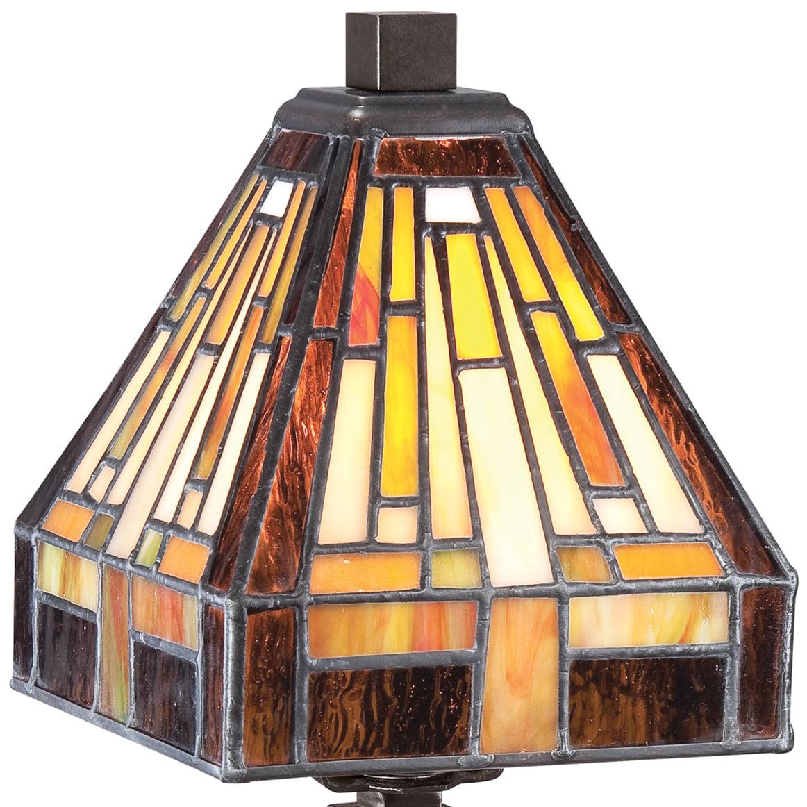 This handcrafted Tiffany style collection illuminates your home with warm shades of amber bisque and earthy green arranged in a clean and simple geometric pattern reminiscent of the works of Frank Lloyd Wright. The sturdy base complements the Arts & Crafts style and is finished in a vintage bronze patina.