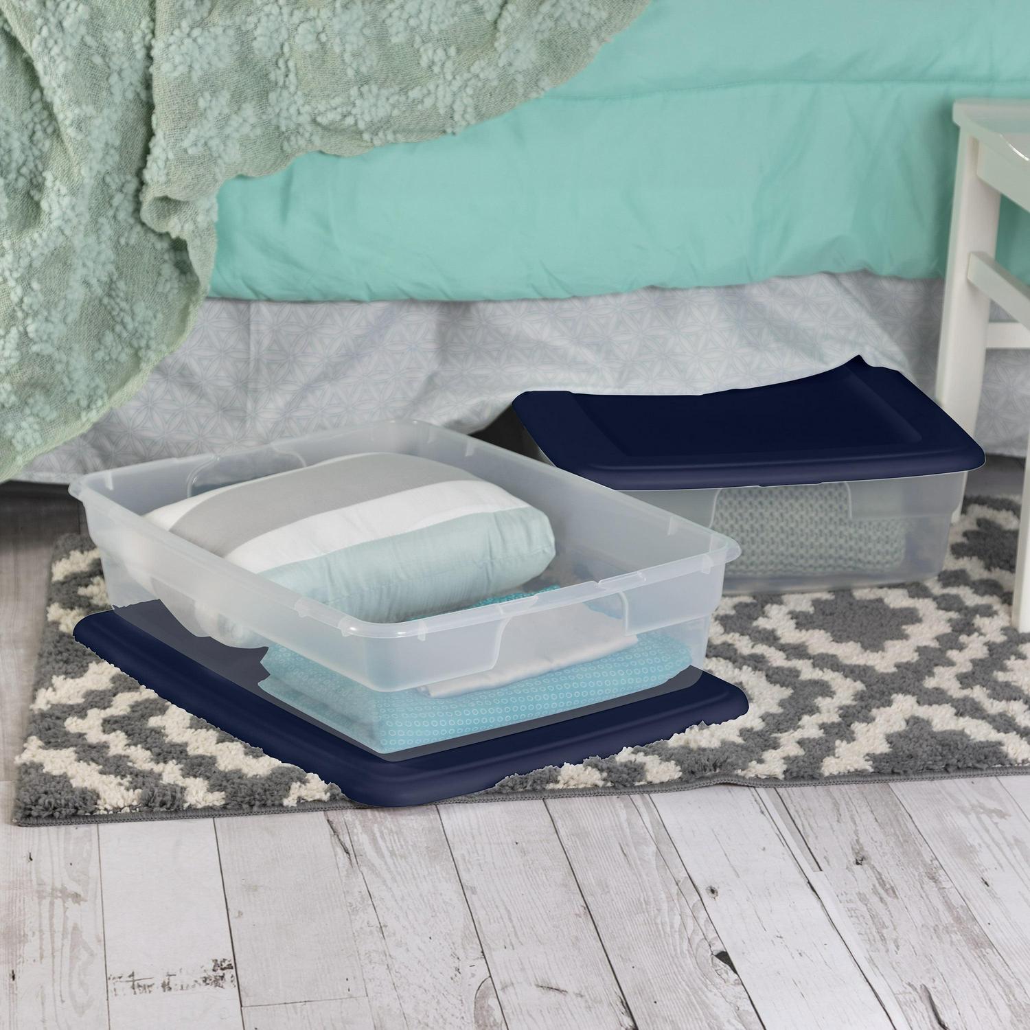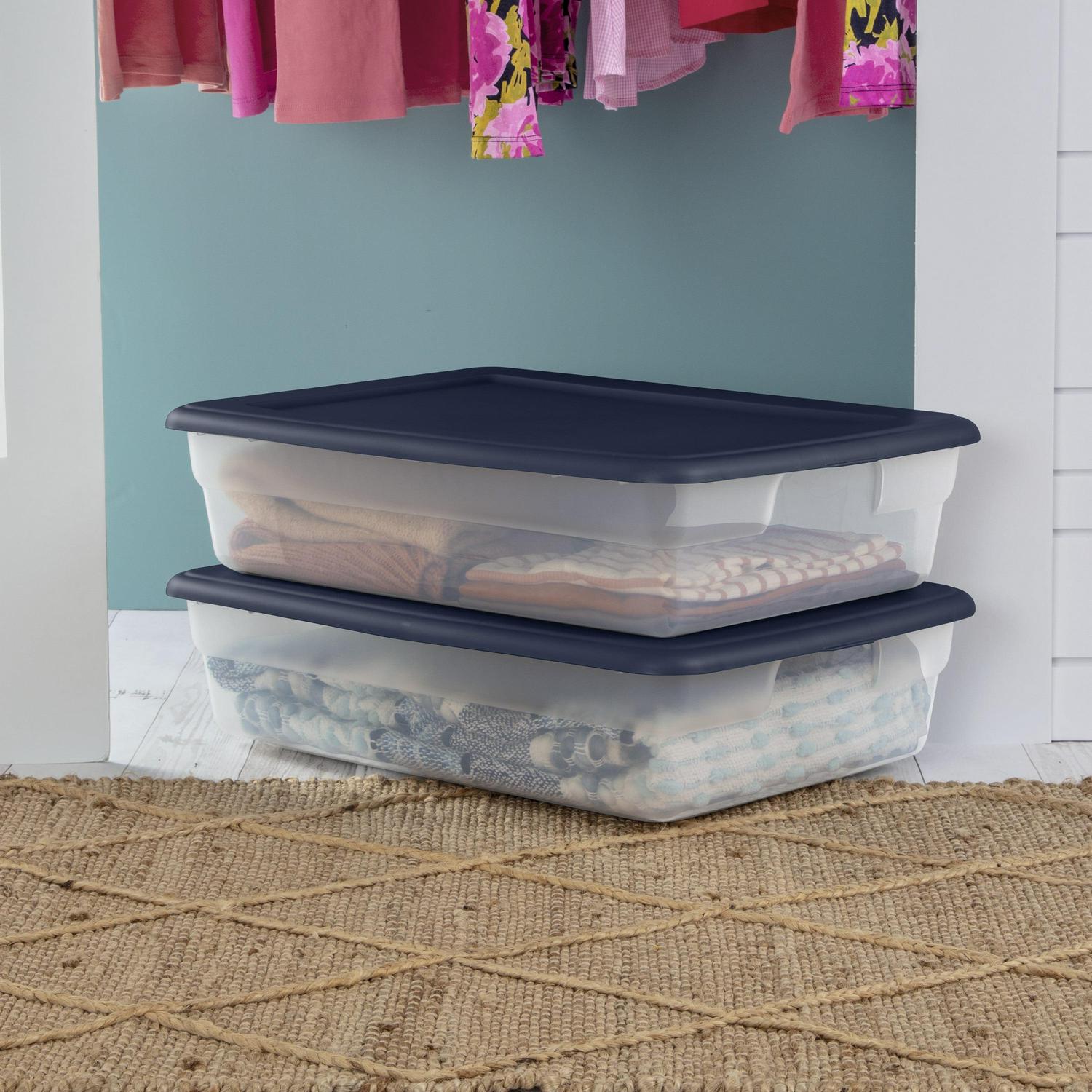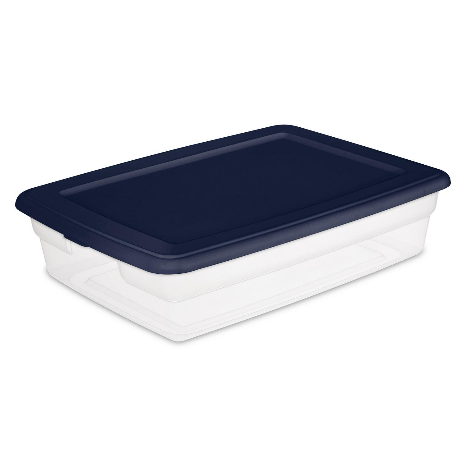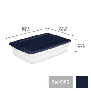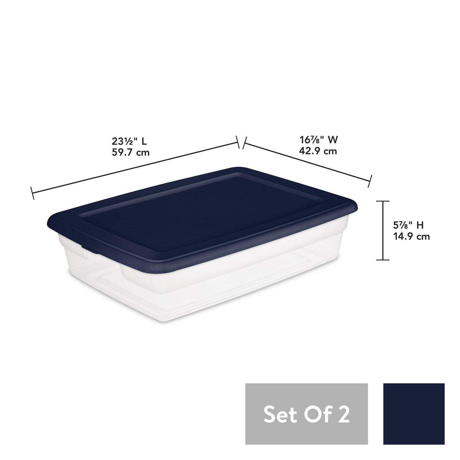 Get organized with the Sterilite Clear Storage Box line! The Sterilite Set of (2) 28 Quart Storage Boxes is a convenient two pack of the popular 28 Quart size, and is ideal for a variety of basic and lightweight household storage needs. It features a clear base that allows contents to be easily identified and an opaque lid that snaps firmly onto the base to keep contents contained and secure. This storage box is ideal for organizing and storing towels, clothing and linens and fits conveniently underneath the bed for out of sight storage. Stack same size containers on top of each other for efficient use of vertical storage space. When storing items away, use good judgment and don t overload them or stack them too high; be mindful of the weight in each box and place the heaviest box on the bottom. The overall assembled dimensions of this item are 23 1/2″ L x 16 7/8″ W x 5 7/8″ H.