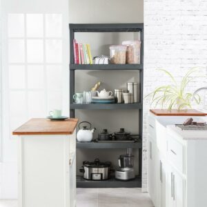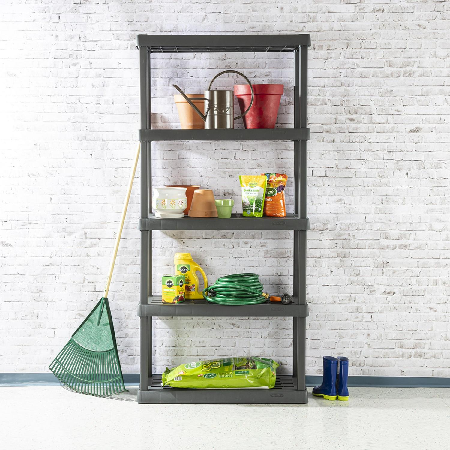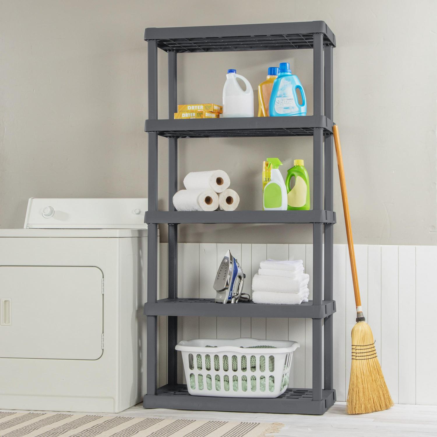 Organize with ease! The durability, modularity, and simplicity of Sterilite s 5 Shelf Shelving Unit makes it the ideal solution for basements, attics and garages. The trend forward Flat Gray color is both sleek and refined and complements a variety of living areas, offering additional storage options for pantries, utility /laundry areas, dorms and mudrooms. Rugged tubular construction is designed for heavy duty usage, with ventilated shelves to help keep items dry and mildew and odor free. Heavy duty plastic will not dent, chip, peel or rust, ideal in a challenging environment. Each shelf has a recommended weight limit of 150 pounds. Shelving assembles easily in minutes without the use of tools, simplifying your organizational project. Create a custom storage solution with other Sterilite Hardware items, such as the 4 Shelf Cabinet, 4 Shelf Shelving Unit, and 4 Drawer Unit. Keep supplies, equipment, and other smaller items neatly contained in a variety of Sterilite Totes and Clear Storage Boxes, such as the 25 and 50 Qt ShelfTotes. The overall assembled dimensions of this item are 75 1/4″ H x 36″ W x 18″ D.