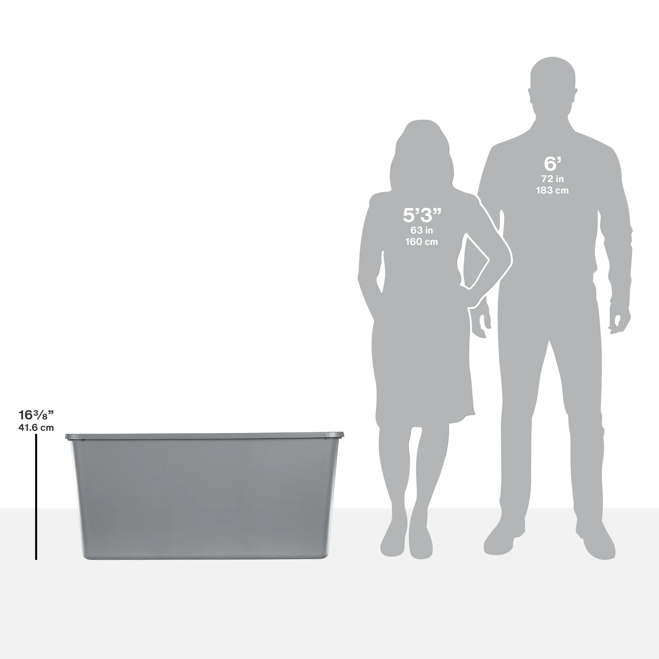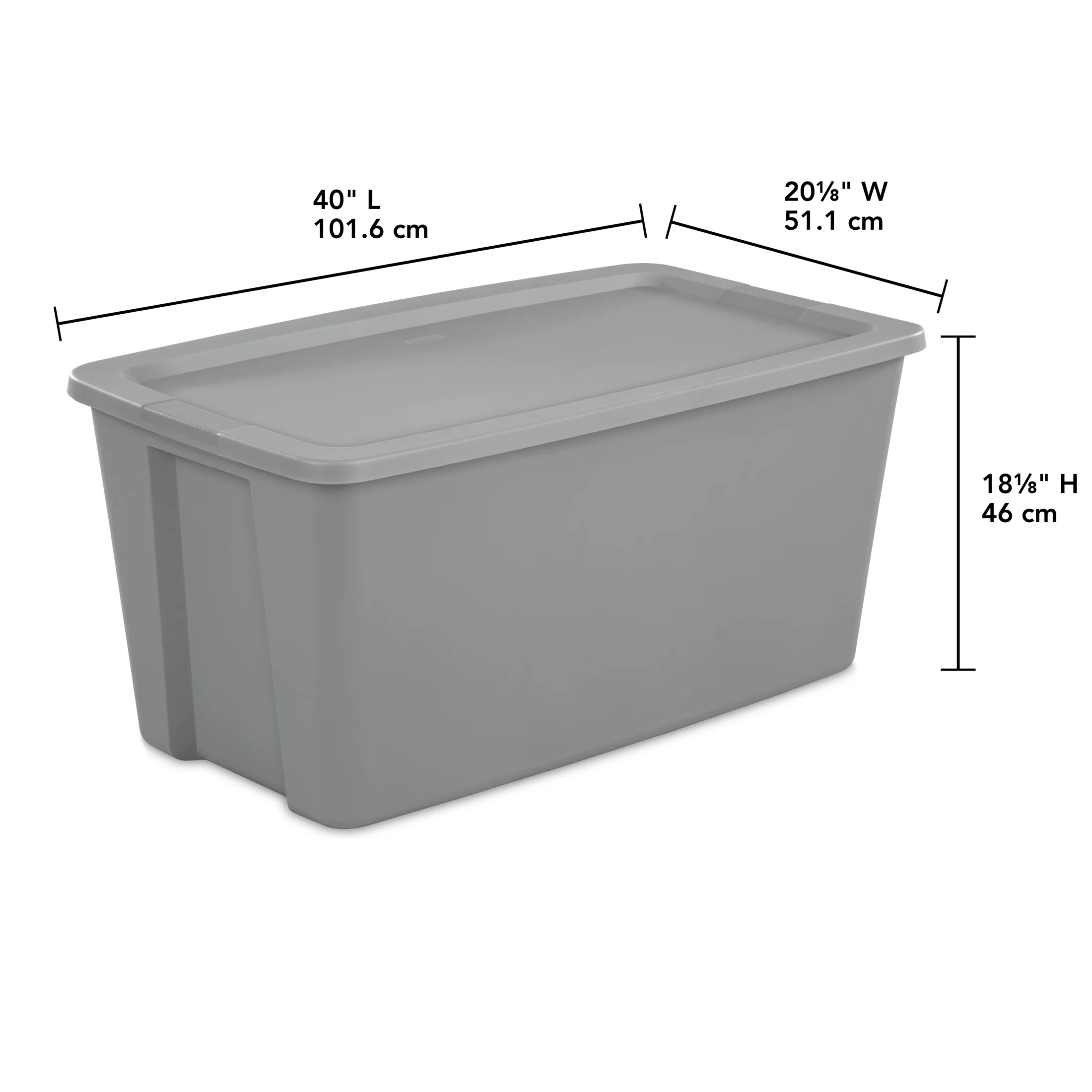 Organize, contain and store it away in Sterilite’s 50 Gallon Tote. Need a storage solution for larger bulkier items? Or do you want to be able to store multiple smaller items conveniently in the same place? This jumbo sized tote is the ideal solution for both types of storage needs. The extra-large capacity allows you to sort and store bedding, off-season clothing, bedding, seasonal decorations, sporting gear, and more in the basement or attic! The simple squared off design offers a space efficient shape, and a broad rim for added strength. The lid securely snaps to the base, keeping contents safely in place and concealed. The contoured end panels and textured in molded handles provide a comfortable grip for lifting and carrying, making transporting the tote easier. The deep recessed surface of the lid allows totes to stack neatly on top of each other for efficient use of vertical storage space. When storing items away, use good judgment and don’t overload them or stack them too high; be mindful of the weight in each tote and place the heaviest tote on the bottom. The overall assembled dimensions of this item are 40″ L x 22 1/8″ W x 18 1/8″ H.
