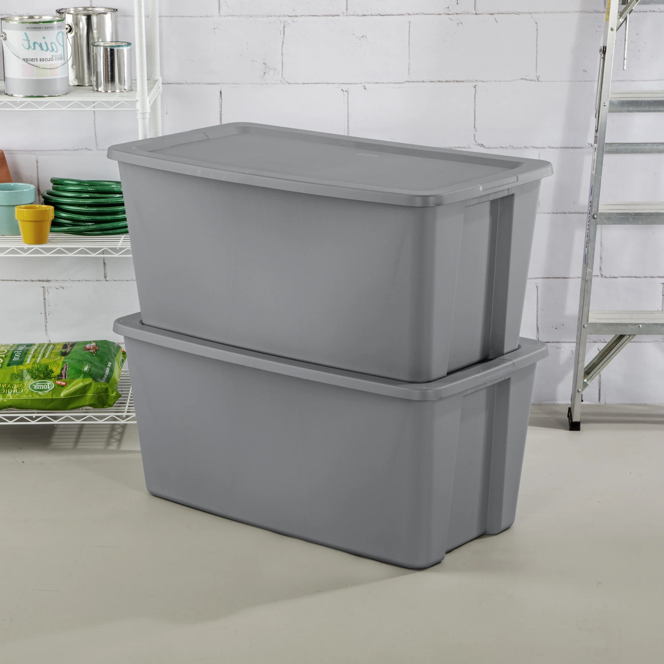 Sterilite 50 Gallon Tote, Extra Large Plastic Storage Bin with Snap-On Lid, Gray, 4 Count