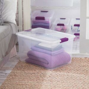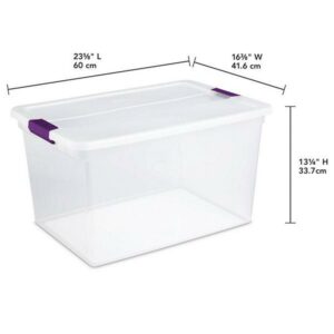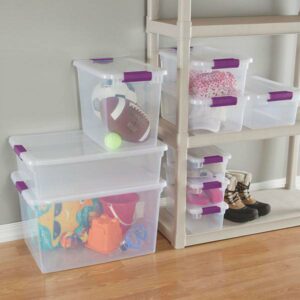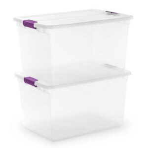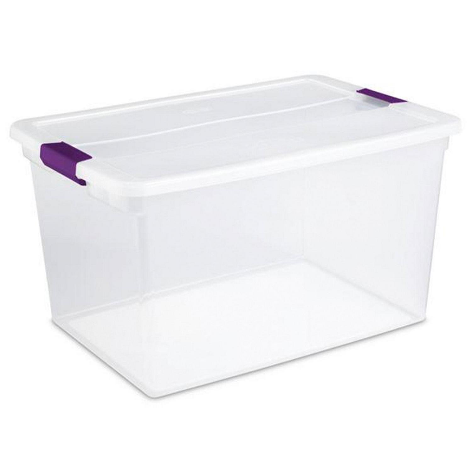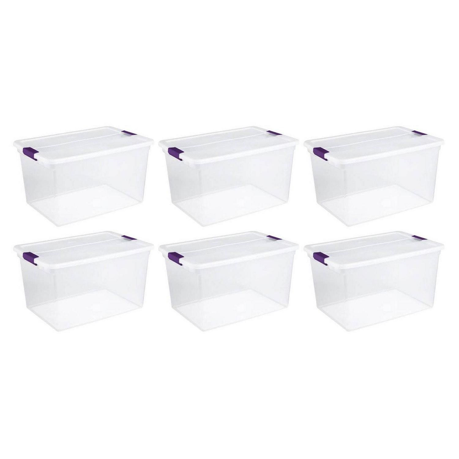Clear some clutter out of your life and tuck away stuff big and small with the help of this handy 6-pack of Sterilite 66-Quart Nesting Clear Latching Handle Storage Container Tote. These durable plastic storage containers feature ergonomic latches that attach the lid securely to the base and are easy to unlatch. Designed with purple handles, the see-through bases and lids allow easy viewing so contents can be easily identified from any angle, even when these totes are in storage. Thanks to the indexed lids for secured stackings because you can also nest these plastic storage bins, one on top of the other. This storage box is ideal for storing blankets and other bulky items around the home. These multi-purpose Sterilite boxes feature contemporary styling with ergonomic, color-coordinated latches. Take a little confusion and frustration out of storage and get organized today with these Sterilite 66-Quart Nesting Clear Latching Storage Totes.
