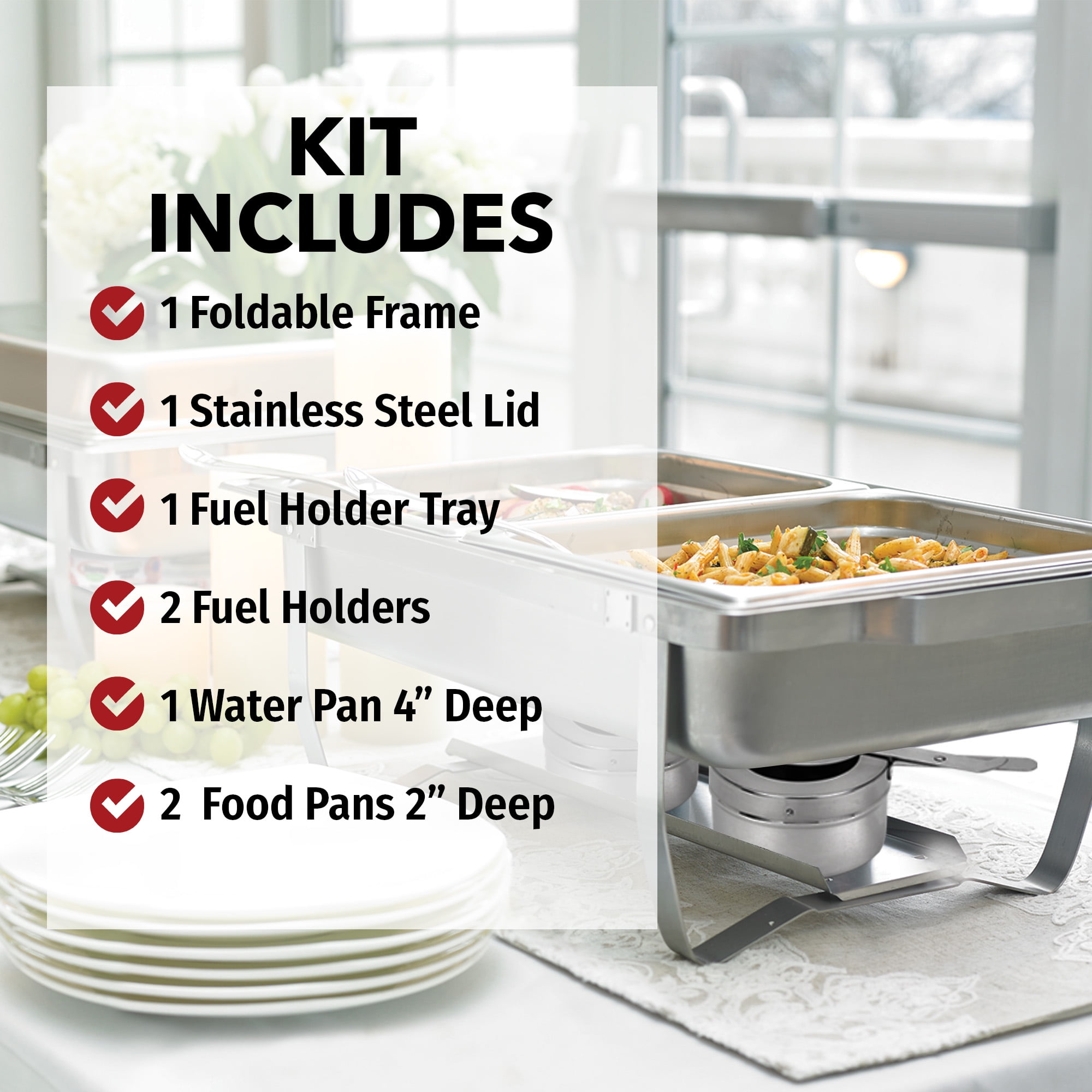 Complete Food Warming System for Hot Meals: Our chafing dish buffet set includes 1 foldable frame, 1 lid, 1 chafing fuel tray, 2 chafing fuel can holders, 1 water pan, and 2 half-size food pans to let you set up and serve delicious meals in minutes! Easy & Convenient Way to Keep Food Warm: Say goodbye to traditional chafing dishes! The Sterno buffet kit ensures your cooked food stays hot throughout the event without the need for messy cleanups. For best results, use with Sterno canned heat. Made for Home & Commercial Use: Be it for serving meals at home or for your catering business, our catering supplies and equipment simplify food prep and meal presentation. Find what you need for the next event you’re planning in our wide product selection. Experience a Heritage of Excellence: For over 100 years, Sterno embodies the timeless tradition of fine entertaining. From our iconic canned heat to cutting-edge flameless SpeedHeat, you can rely on Sterno to help turn every occasion into a success! Hassle-Free Hosting for Memorable Gatherings: Whether you’re organizing a cookout or hosting a holiday party, our innovative foodservice products will change the way you serve food and entertain guests. With Sterno, every event will be unforgettable!