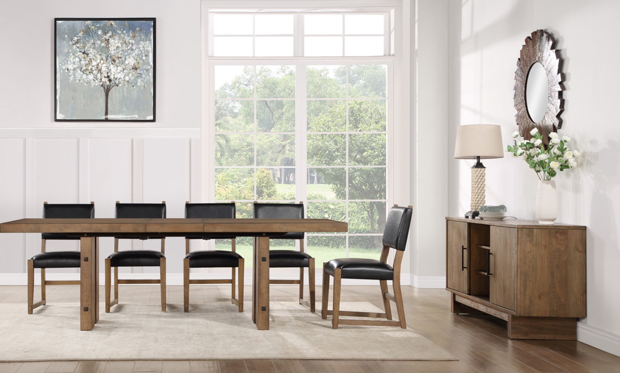 Crafted from Asian hardwood solids and veneers with engineered woods Black Leatherette Seat Crafted from Asian hardwood solids and veneers with engineered woods Wood is hand-stained in a natural multi-step Dark Driftwood finish