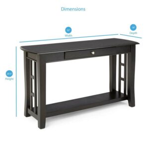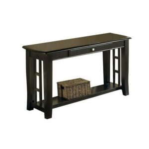 The Cassidy Console Table is the perfect addition to your contemporary foyer or living room. Add a lamp or decorative pieces for a handsome, modern display. This long table features a handy center drawer and a full-length bottom shelf for extra storage. Made of hardwood solids and wood veneers in a sophisticated flat black finish, this simple table has a decorative geometric lattice on the sides for a hint of Asian style. The solid square legs flare out slightly at the bottom, completing the sleek, contemporary look.