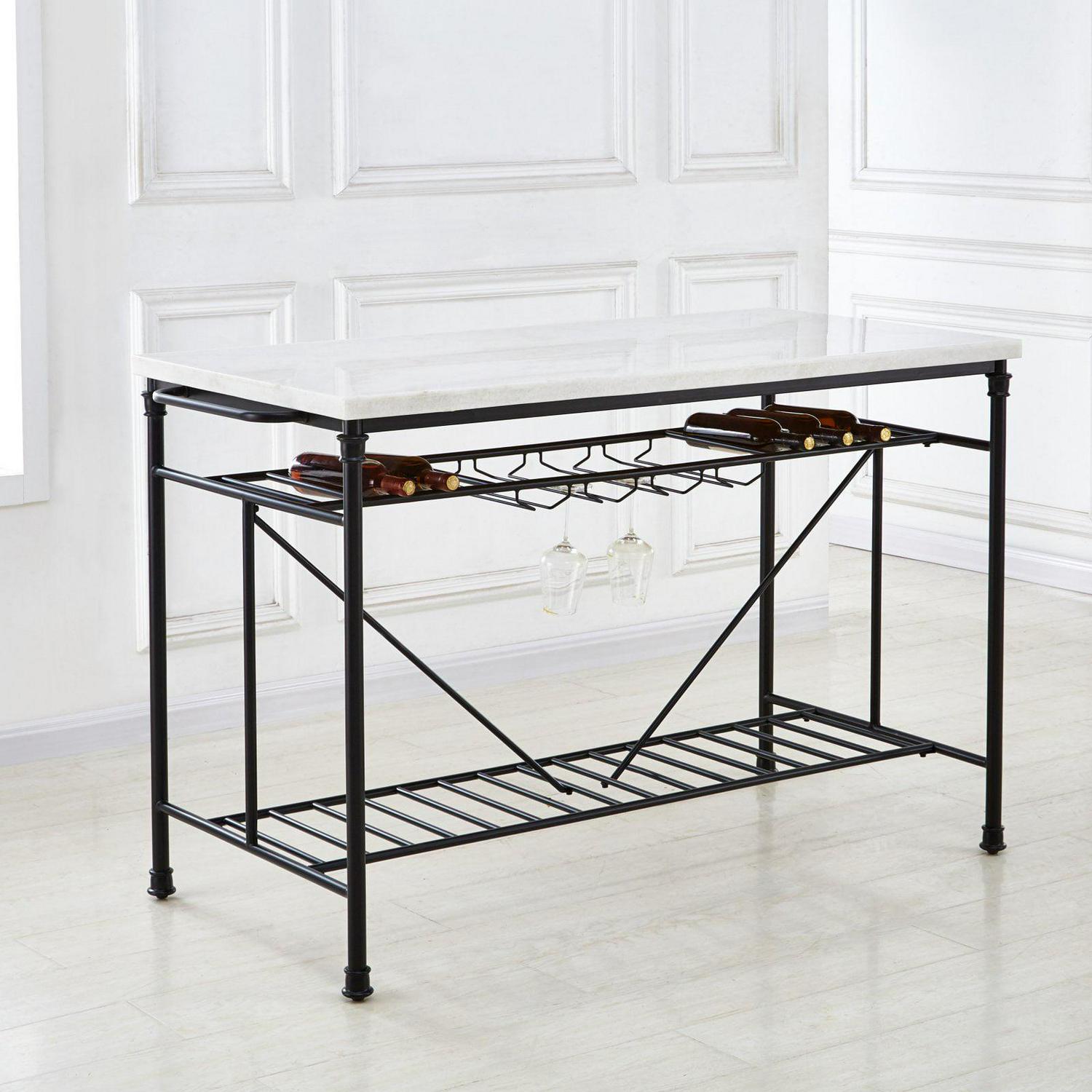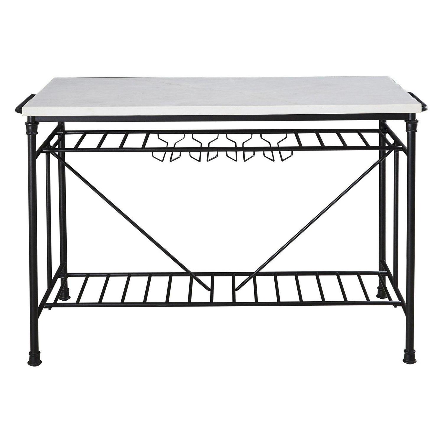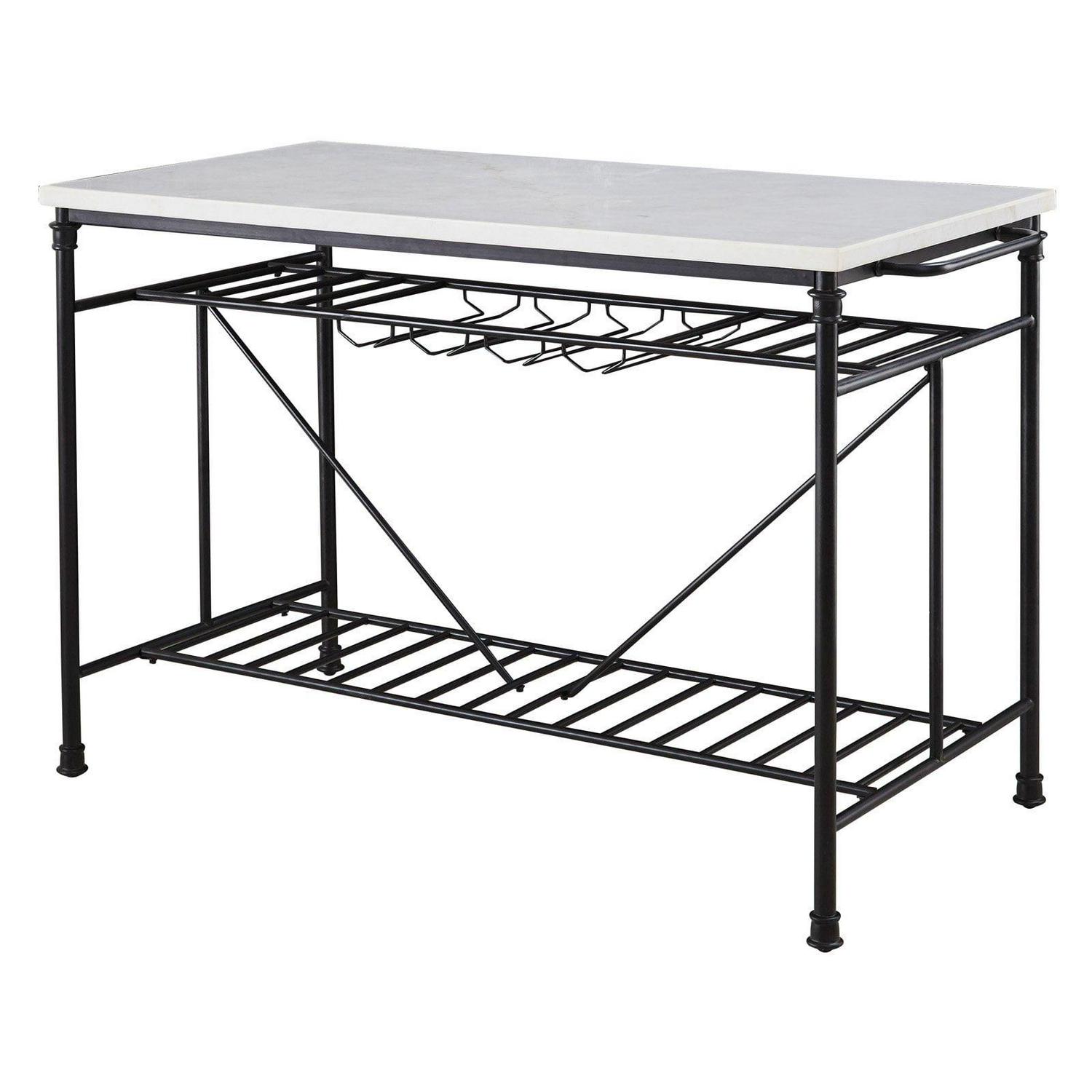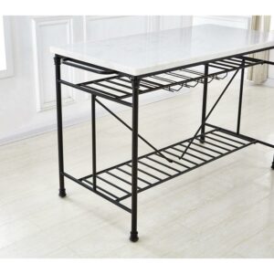 Entertaining is easy with the Steve Silver Co. Claire Kitchen Island. This kitchen island has an iron base in a black finish, which contrasts nicely with the rectangular white marble top. Just below the marble top is storage for wine bottles and a space for hanging stemware. There is another bottom shelf where you can store additional items like plates and linens. Prepare meals on the island or enjoy a glass of wine with a friend. With its sleek design and contrasting finish, the Steve Silver Co. Claire Kitchen Island is sure to elevate the style of your kitchen or dining area.