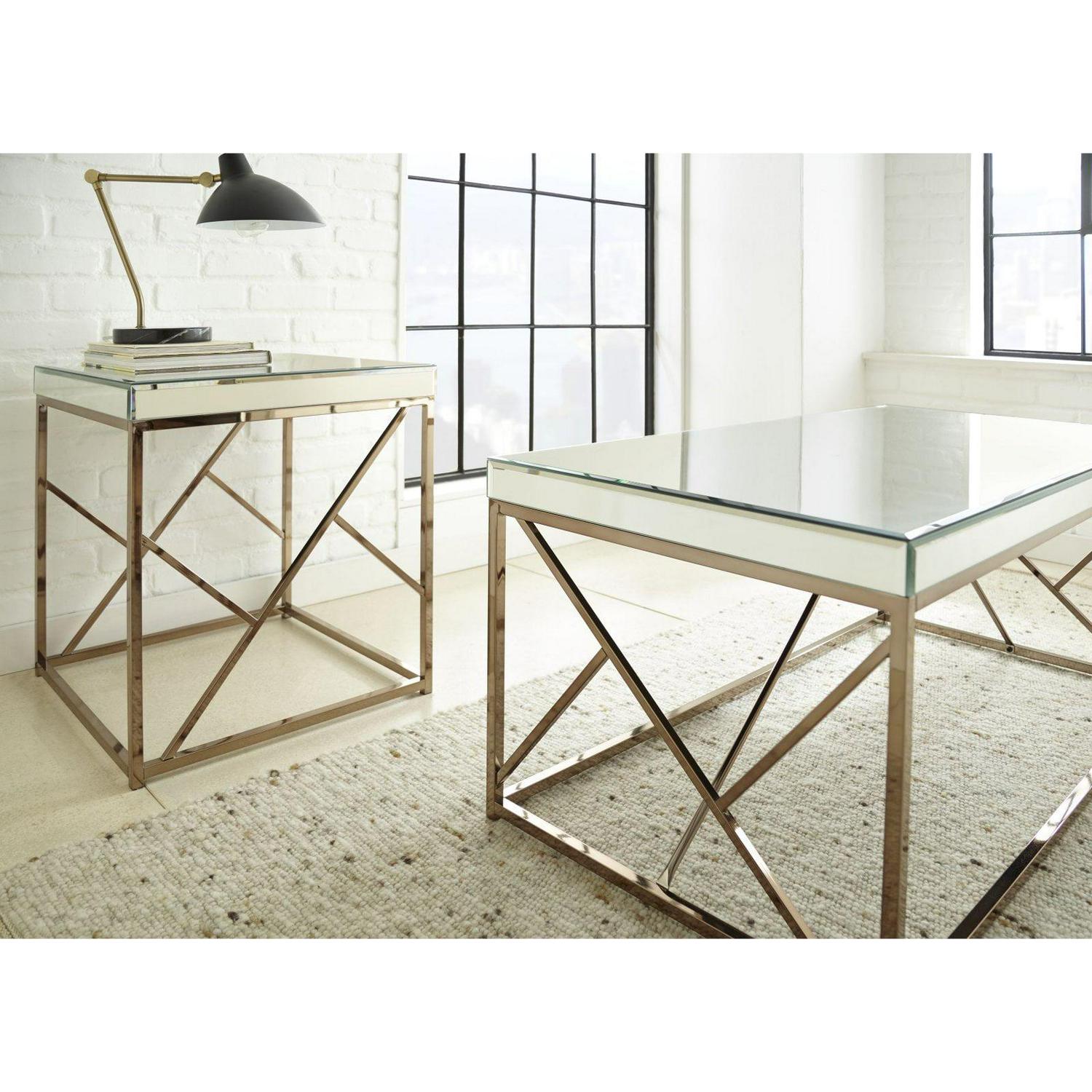 Mirrors add vibrancy, light, and the illusion of space to décor styles, and the Steve Silver Co. Evelyn Cocktail Table will do the same in your living room. Both the top and apron feature beveled mirrors designed to dazzle, while below, the iron frame combines a copper chrome finish with bold, geometric angles. The result is a fashionable focal point with a modern edge.