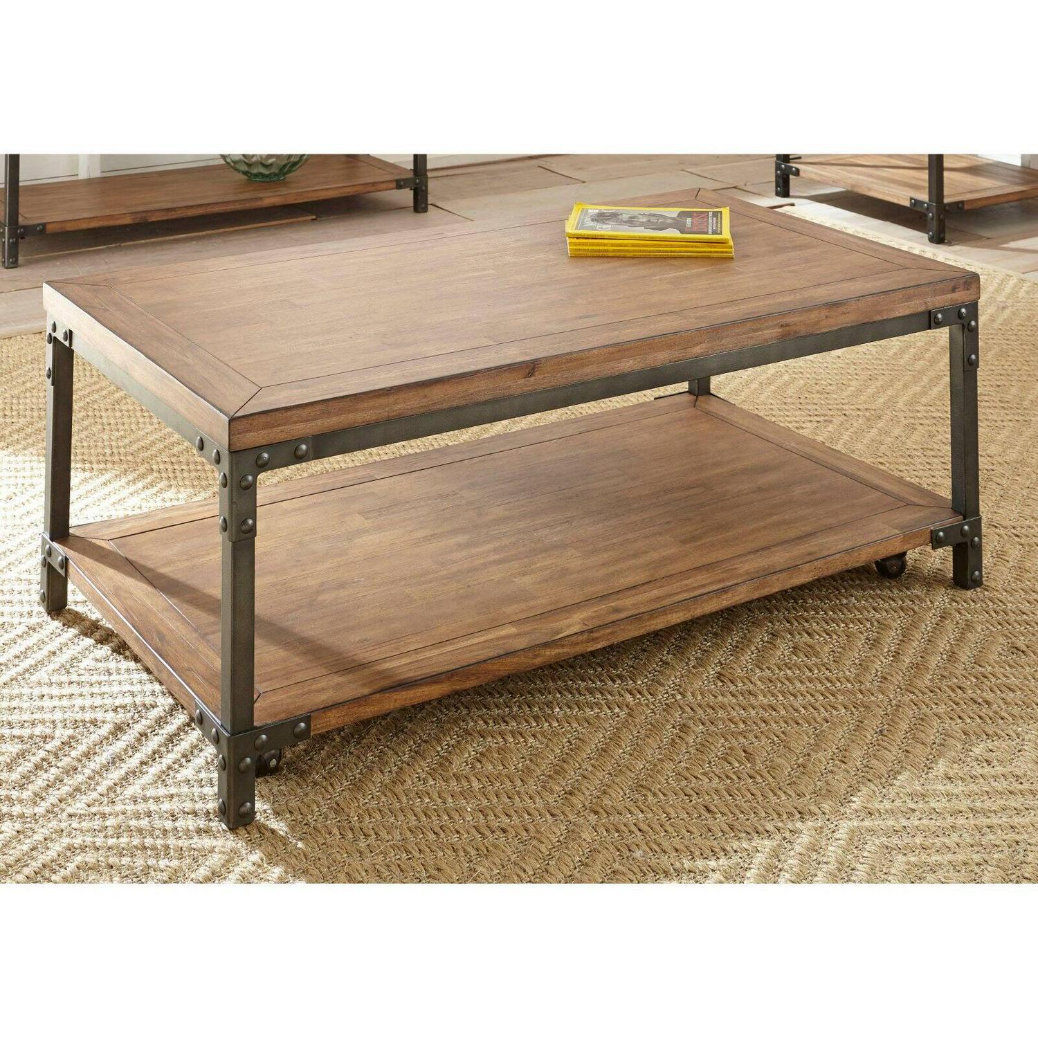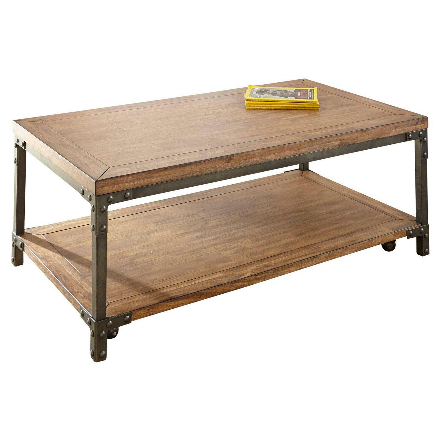 The rustic industrial Steve Silver Co Lantana Cocktail Table with Caster gets a smart update from its hidden casters. This cocktail table boasts an acacia veneers top and lower shelf in an antiqued honey finish. Its rugged metal frame in a black finish gets an industrial kick from exposed rivet details.