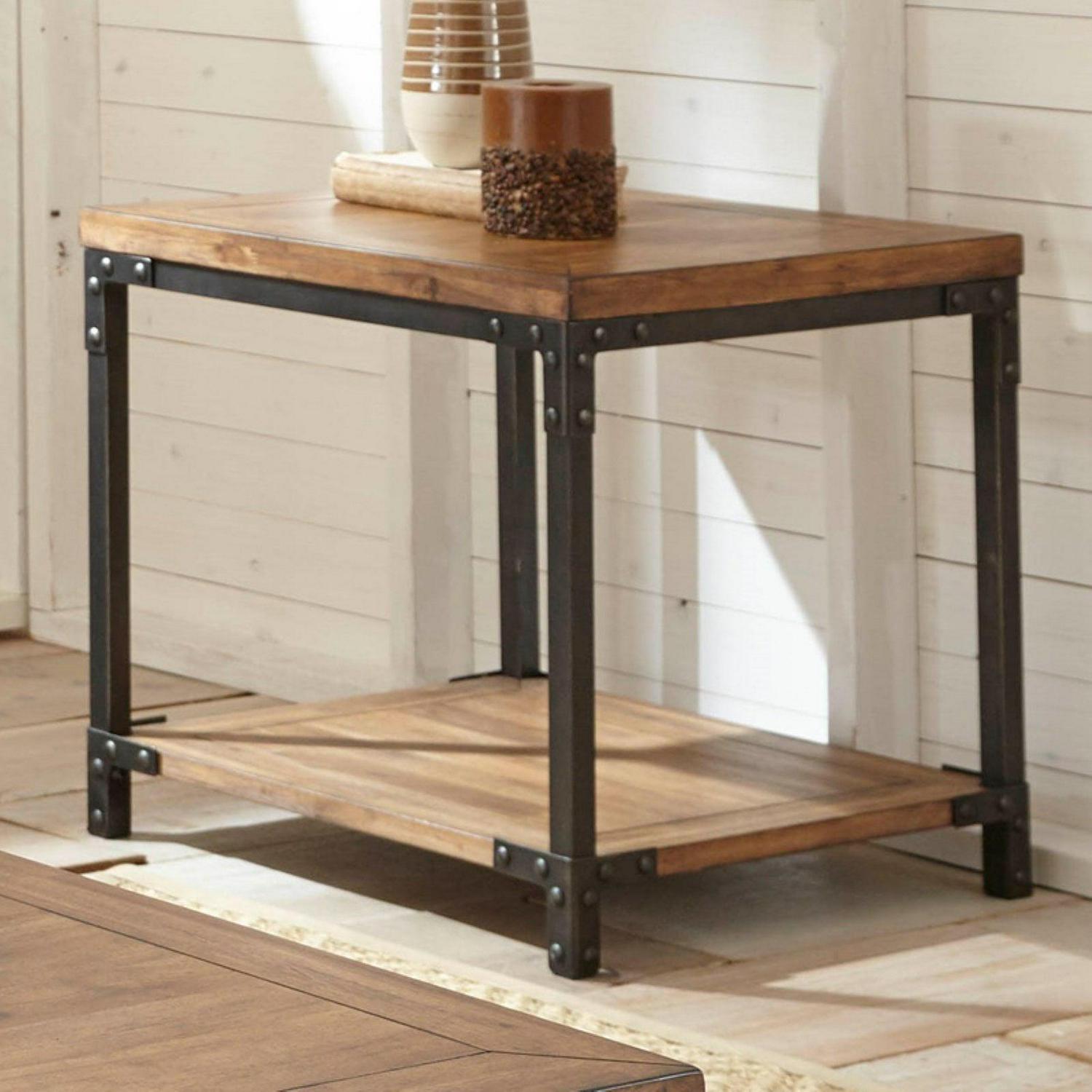 Enhance the rustic industrial design in your living space with this Steve Silver Co Lantana End Table. This end table features an acacia veneers top and base shelf in an antiqued honey finish. Its rugged black metal frame is detailed with rivets for an industrial kick.