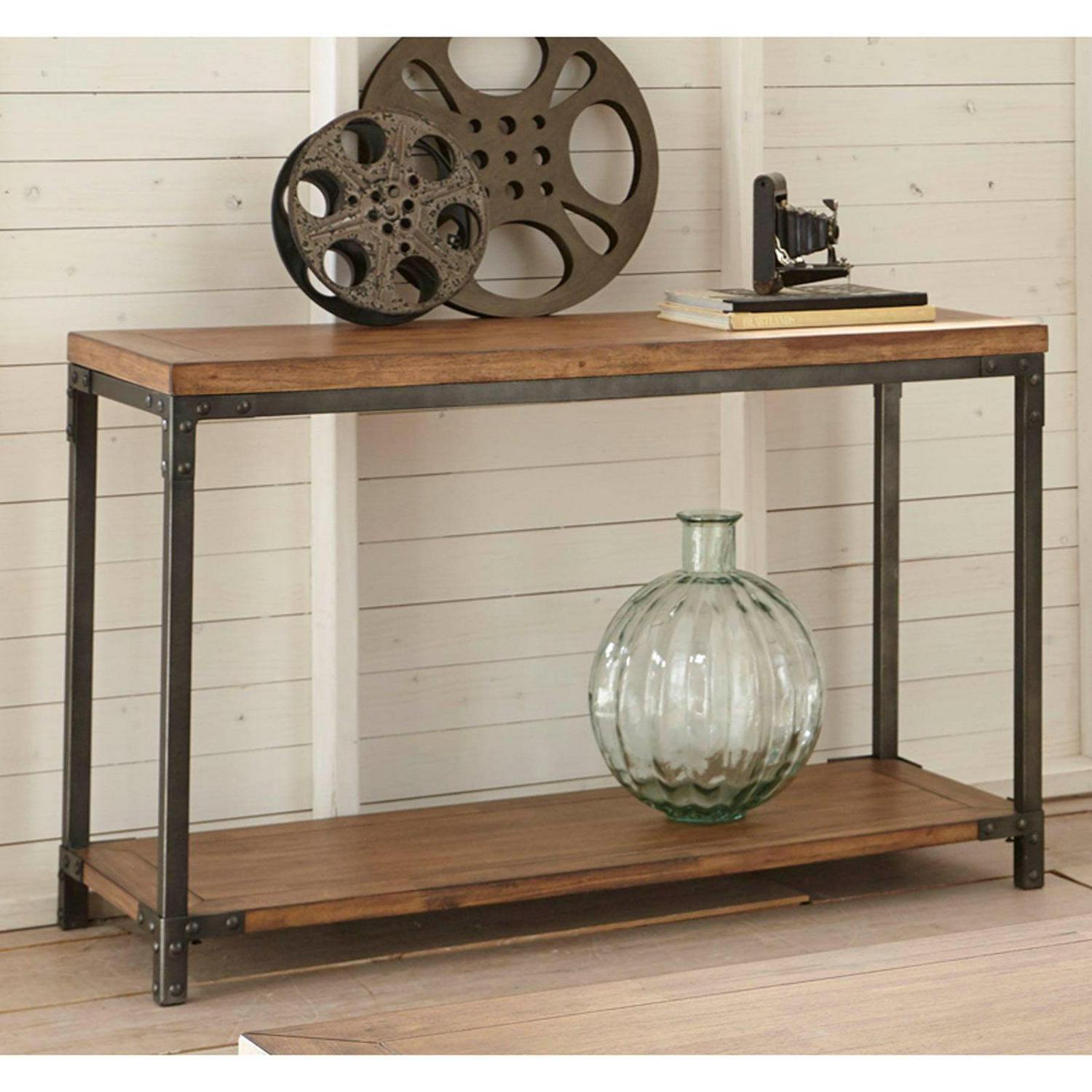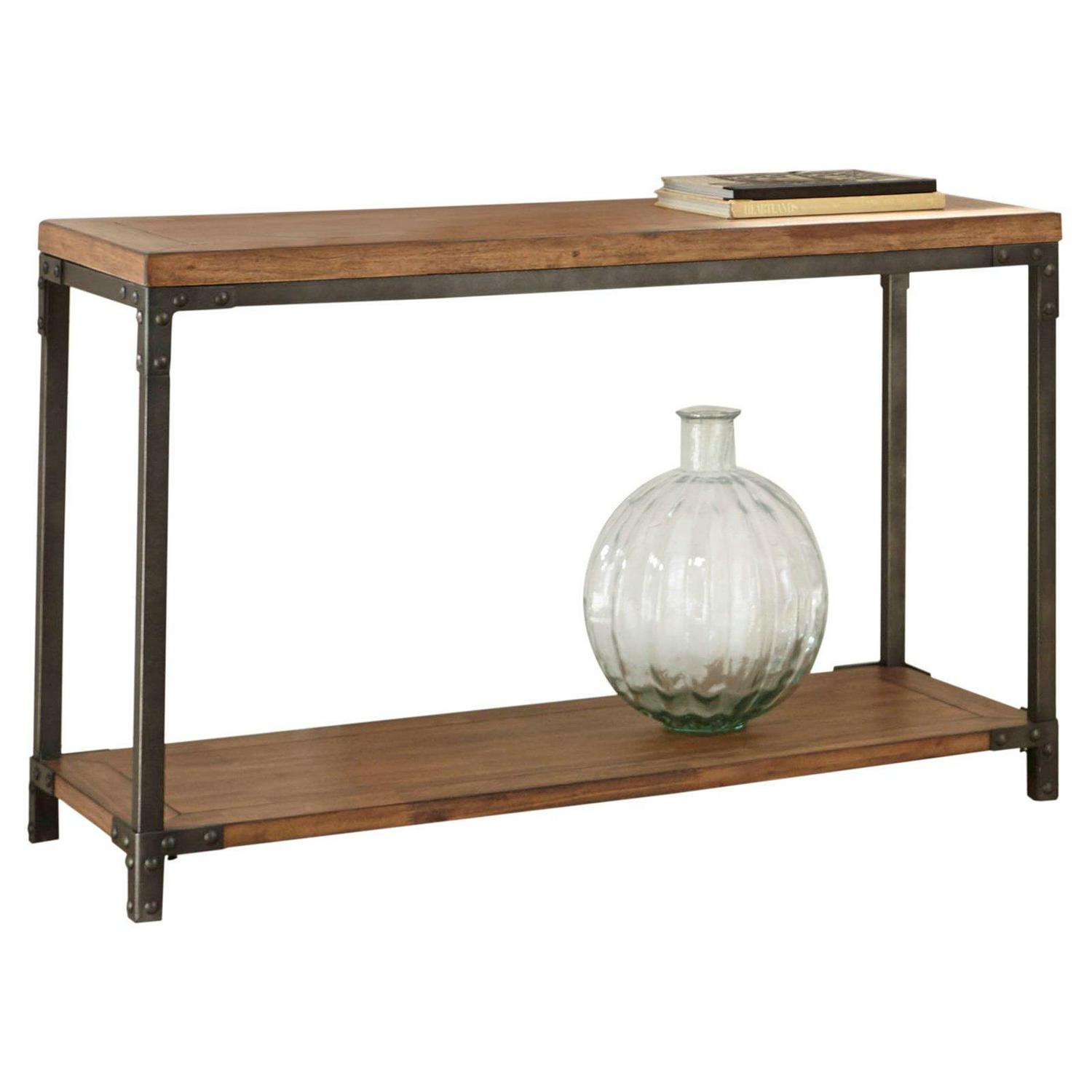 This Steve Silver Co Lantana Sofa Table is tall, lean, and rugged. This sofa table is scaled to fit your foyer, hallway, or behind the sofa. It features an acacia veneers top and base shelf in an antiqued honey finish. This sofa table stands on a rustic black metal frame with exposed rivet details.