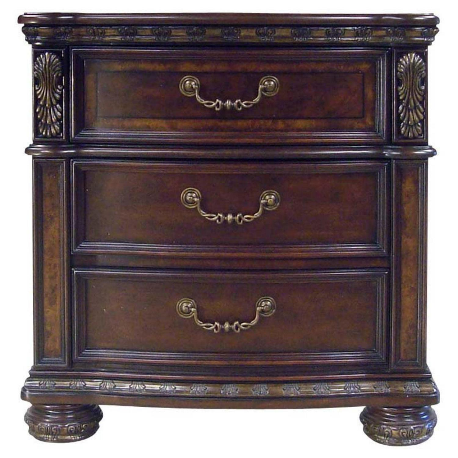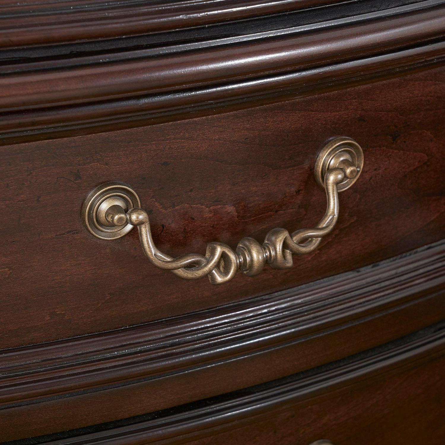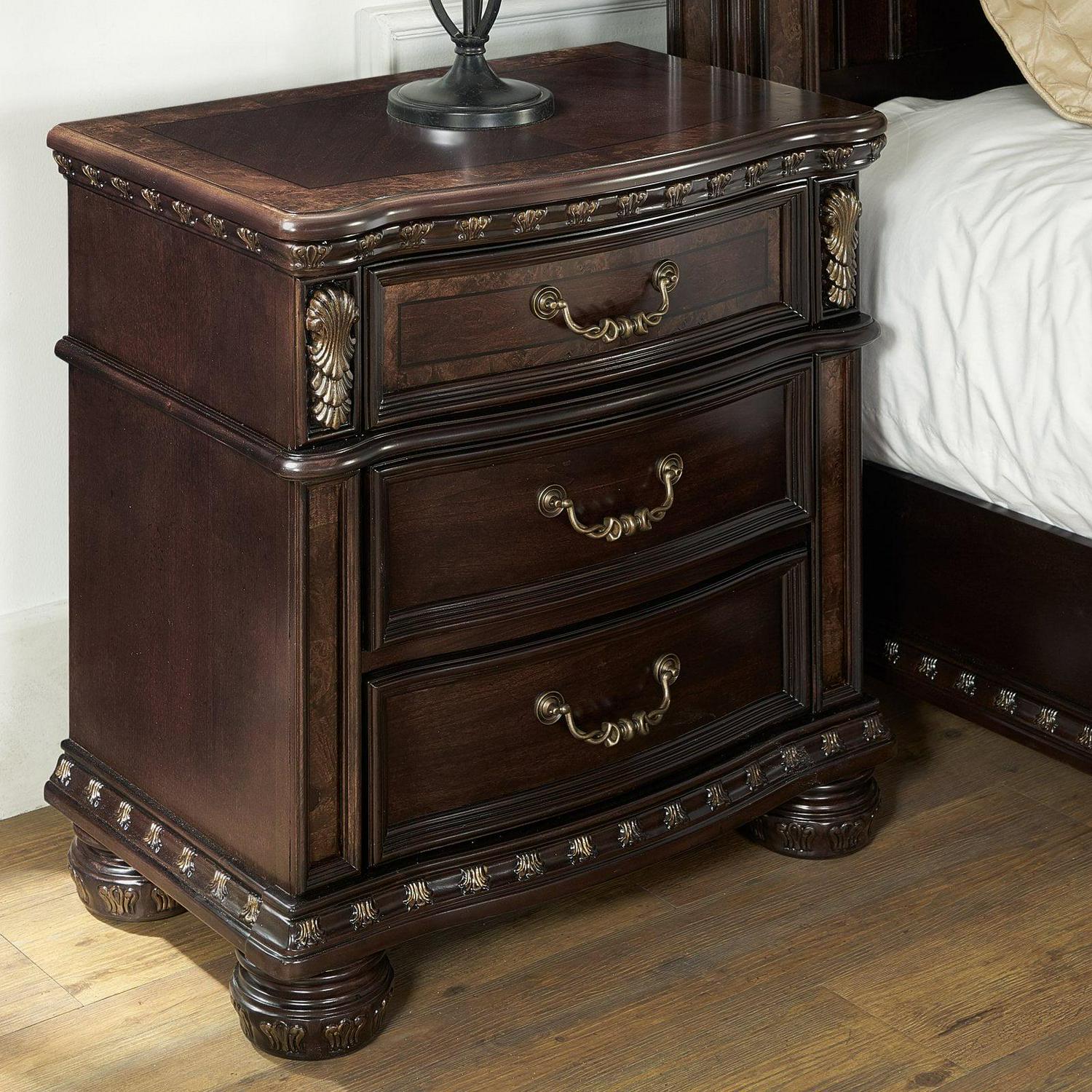 Ornately styled, the Steve Silver Co. Monte Carlo 3 Drawer Nightstand will add a posh look to your bedroom décor. This nightstand features premium hardwood and veneer construction and is complemented by a versatile cocoa finish. Its three drawers are crafted with precise dovetail joinery, which enhances its artisan-worthy design. Carved gold-tipped floral accents and carved bun feet echo this nightstand’s elegantly traditional look.
