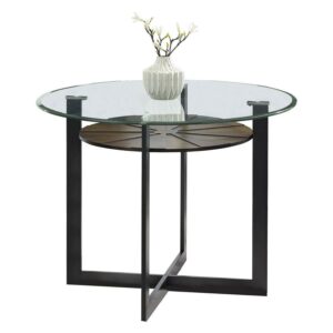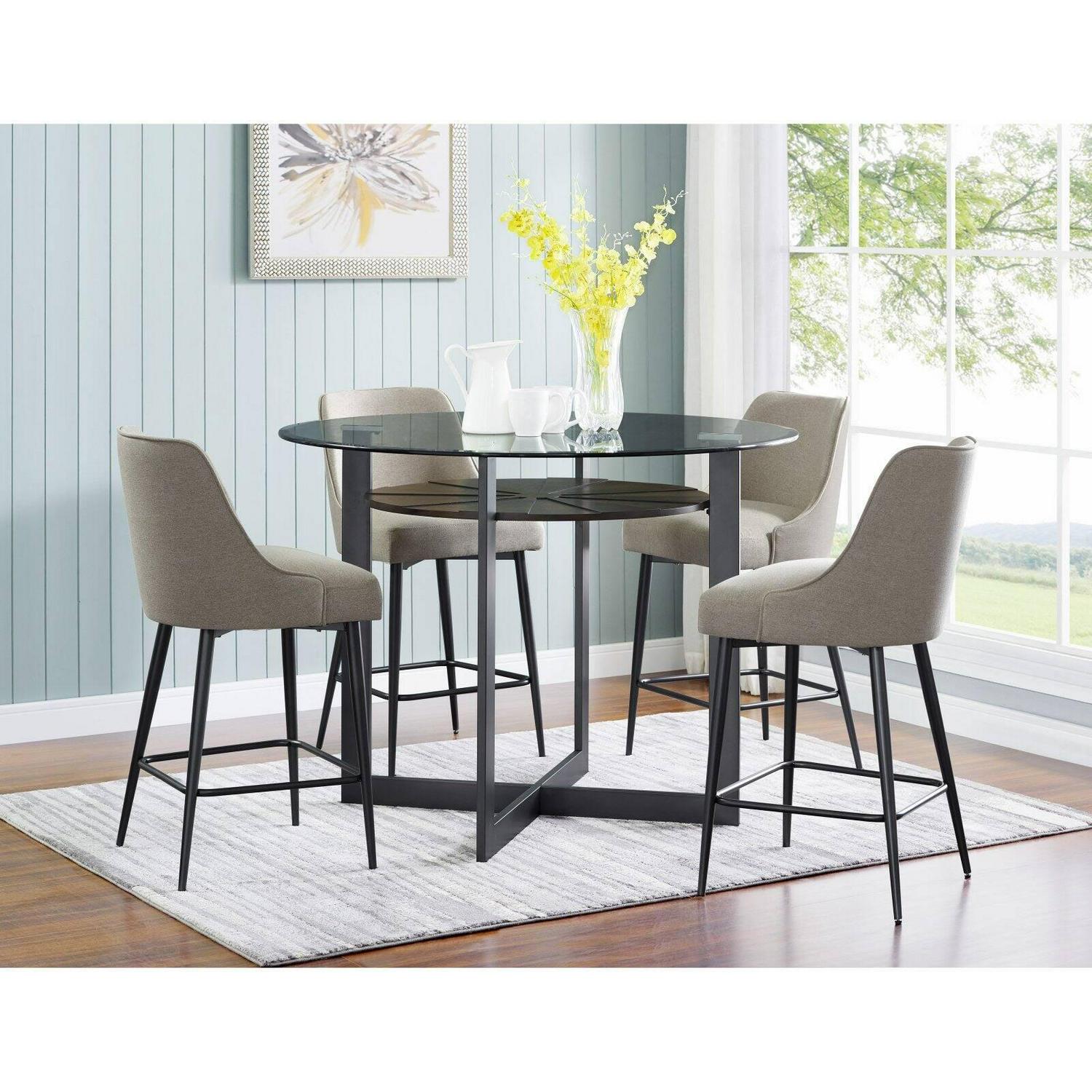 Add a touch of modern style to your dining room with the Steve Silver Co. Olson Counter Dining Table. This round table has a clear, tempered glass top. A shelf made of engineered wood in a brown finish sits just below the tabletop, offering storage space for extra plates, silverware, or linens. The shelf has a starburst design that adds visual interest to the piece. Dark iron legs crisscross at the bottom to create the table’s base. You can comfortably seat up to four people at this table and enjoy a delicious meal.