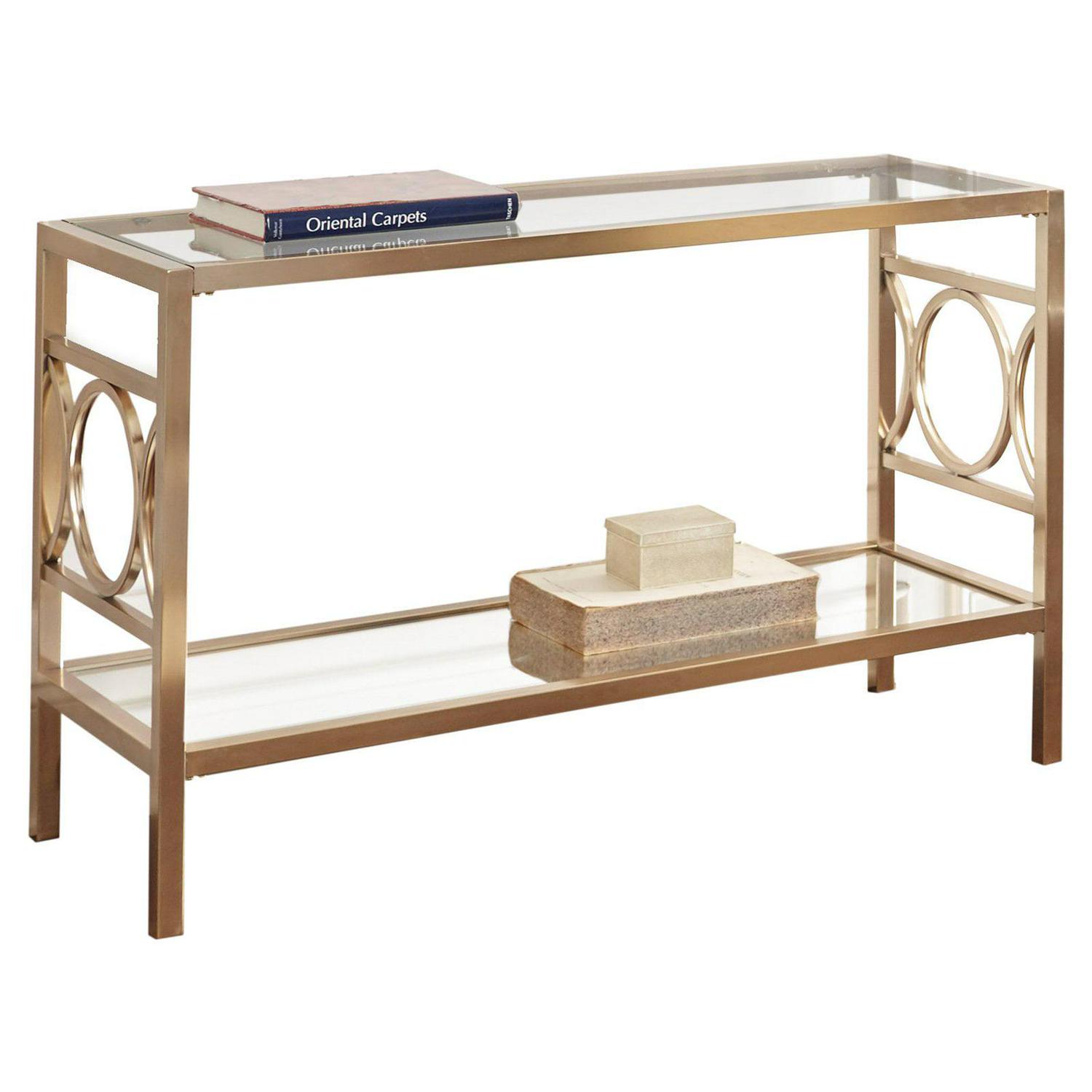 The long and lean Steve Silver Co Olympia Sofa Table makes modern design effortless. Concentric circles and open lines in a gleaming gold chrome finish give this sofa table its glam appeal. A tempered glass top and mirrored bottom reflect your chic design aesthetic perfectly.