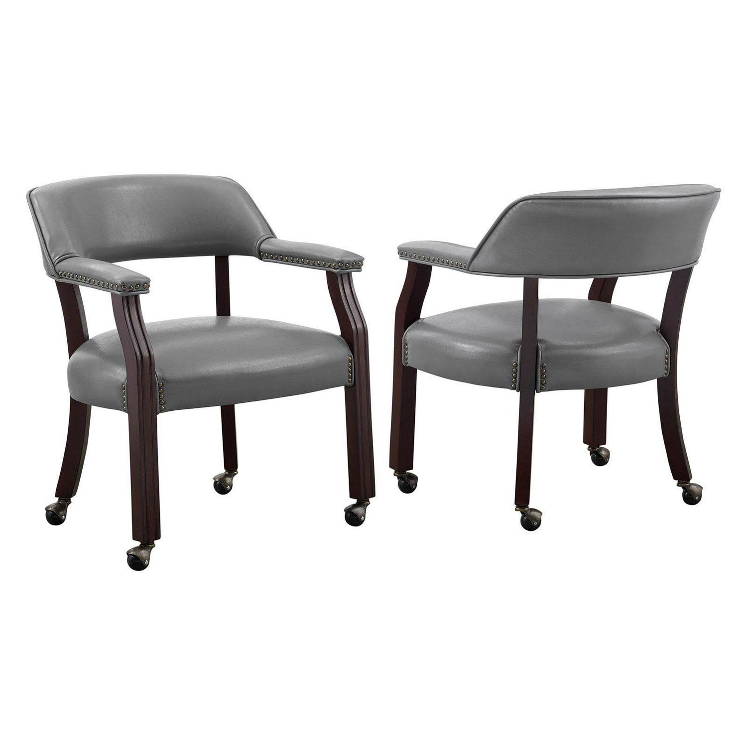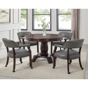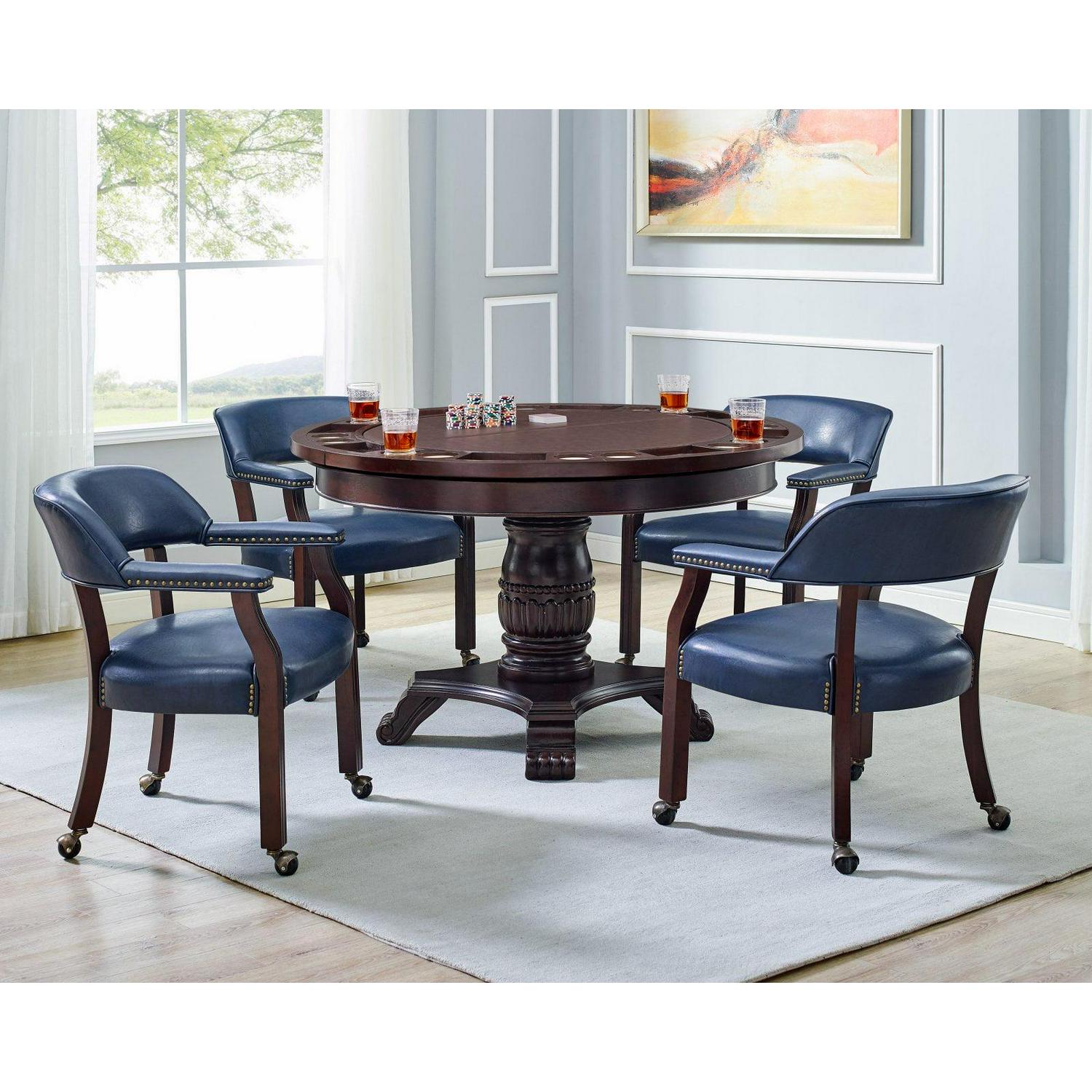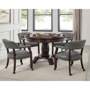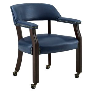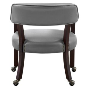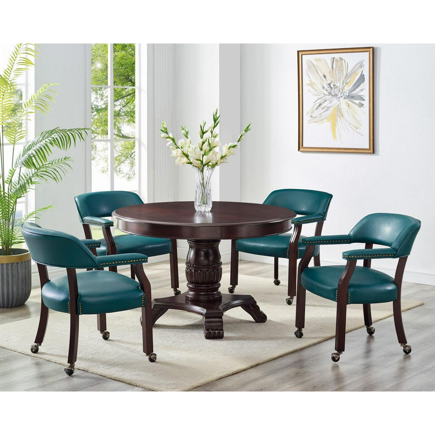 The Steve Silver Co. Tournament Dining Arm Chair with Casters is perfect for your dining table, game night table, or desk. Constructed of rubberwood in a rich cherry finish, this arm chair has a padded seat upholstered in faux leather. Nailhead trim adds visual interest to the piece. Each chair leg ends in casters. Kick back and enjoy a dinner or card game with friends. Choose from available fabric colors to find the arm chair that works best for your home.