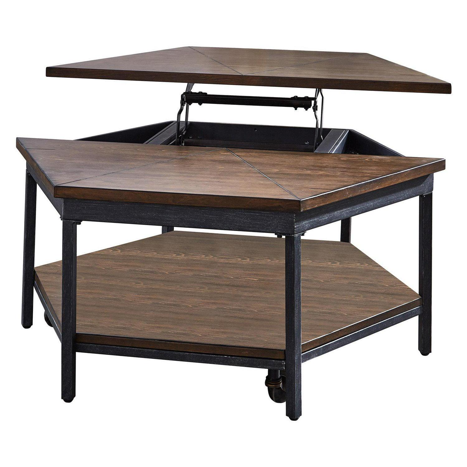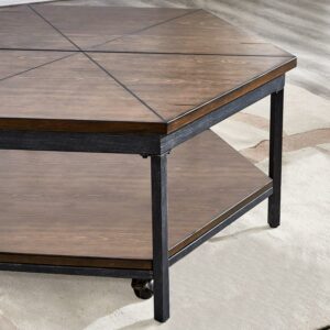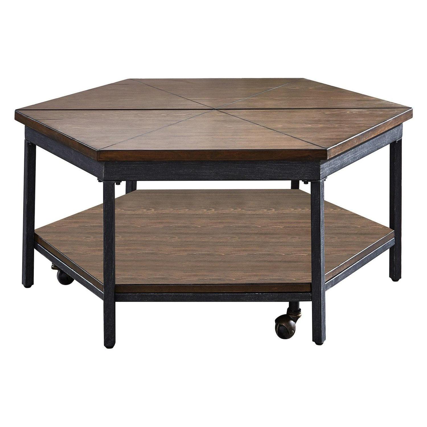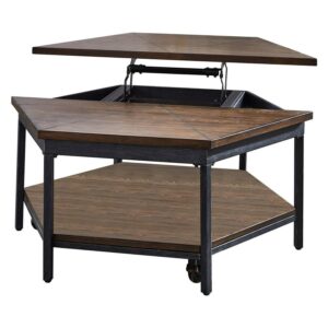 There’s just nothing average about the Steve Silver Co. Ultimo Hexagon Lift-Top Cocktail Table. Instead of right angles this table embraces a hexagonal design with a veneer-patterned top that reinforces that shape. Engineered wood with ash veneers under a mocha finish add the feel of thick timbers while the form is supported on an iron frame. The black finish of the metal nicely complements the wooden shelves. Half of the top panel lifts up on heavy duty hinges to give you a space for working or meals. A set of casters add mobility to the design.