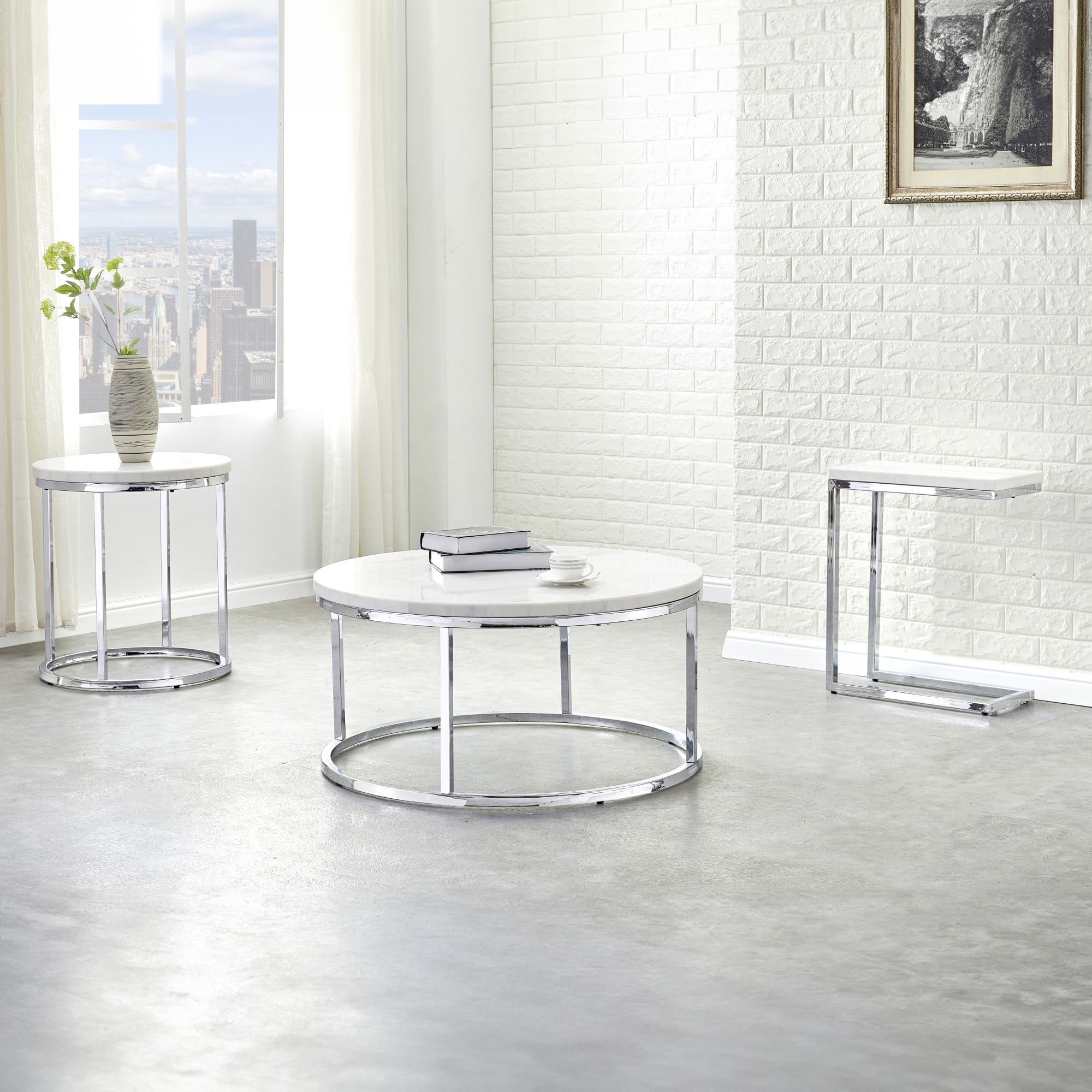 Constructed of white marble tops and chrome finished metal base Perfect piece for contemporary or modern homes Each piece of marble is subtly unique due to natural hue and veining variations