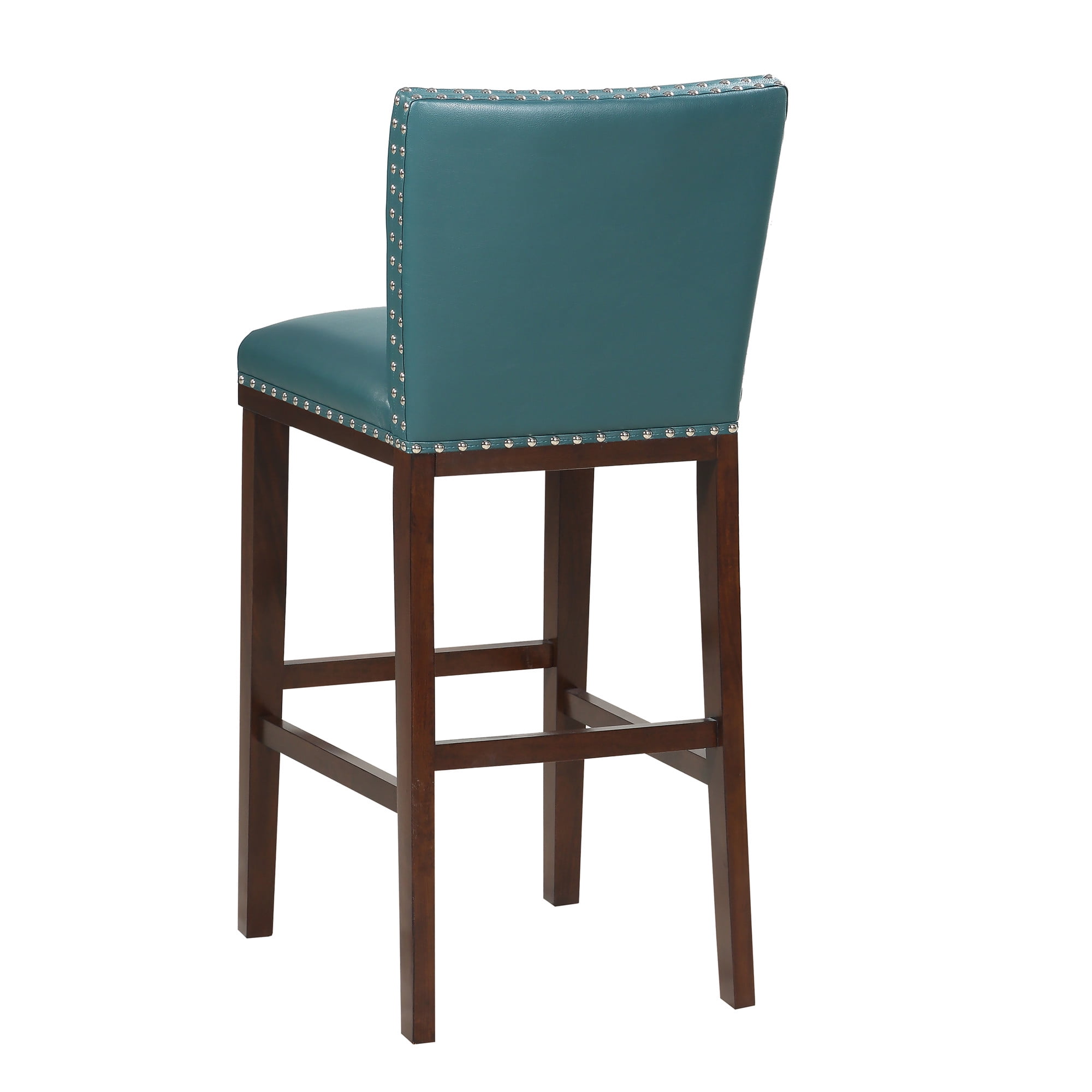 Rich Peacock Blue Green Dimensions: 18W x 23D x 41H in. Seat height: 30 in. from floor Constructed from solid wood and faux leather Wood frame features an espresso finish Features faux leather upholstery Decorative nailhead trim Minimal Assembly required
