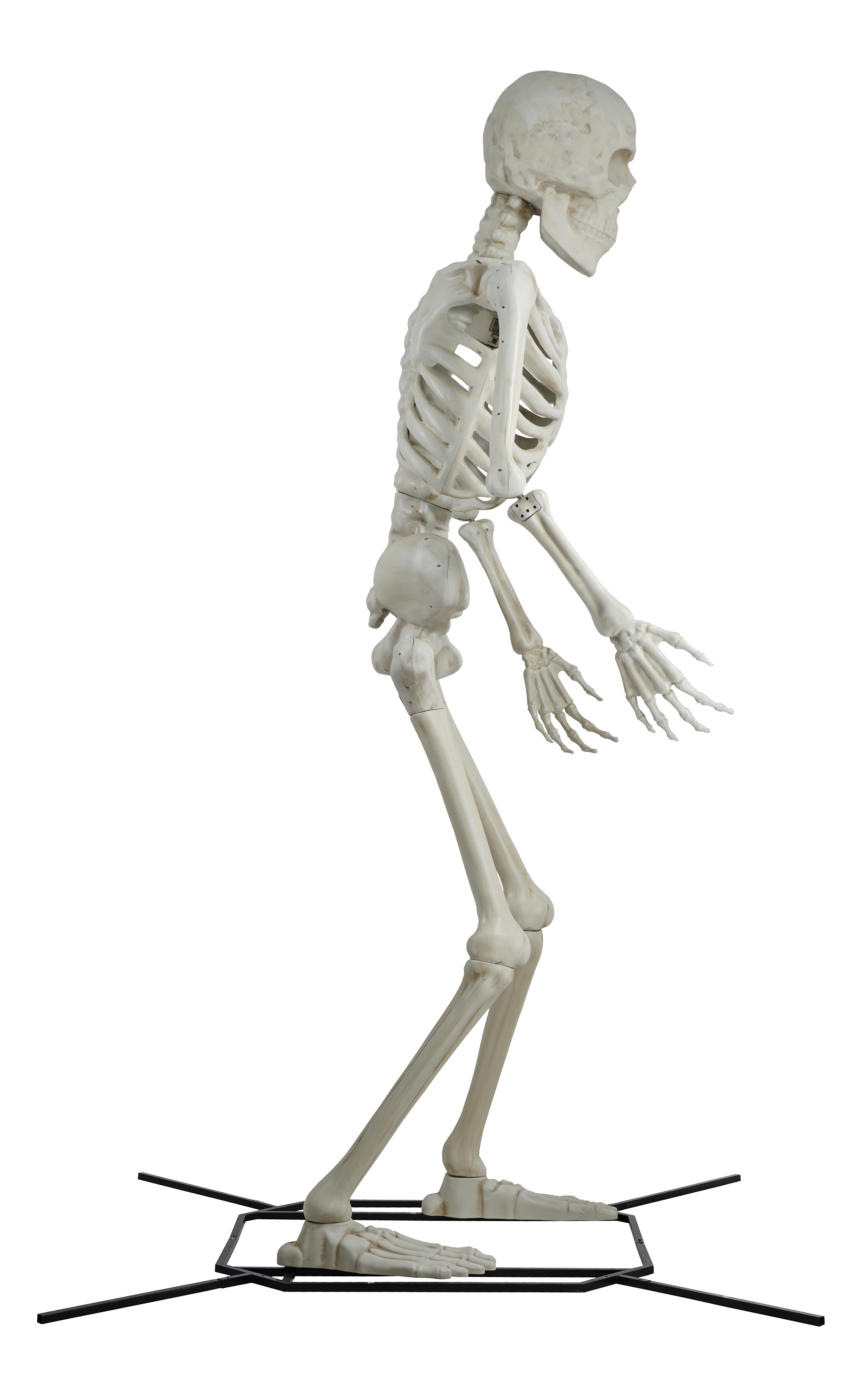 Steve the Poseable 10′ Skeleton Decoration by Way To Celebrate Poseable arms Durable bone colored plastic Wide base with iron legs to help stabilize Includes 4 ground stakes Assembly required Assembled product dimensions: 74 in W X 70.47 in D x 120 in H Perfect for all things Halloween, from haunted houses to parties Pair with other decorations from the Way To Celebrate Halloween collection for a spooktacular Halloween display