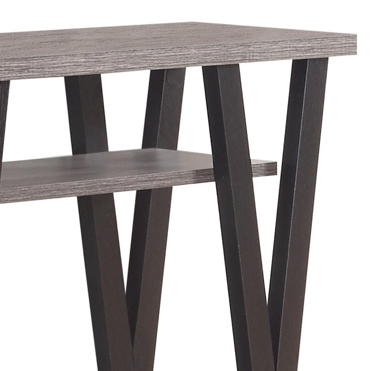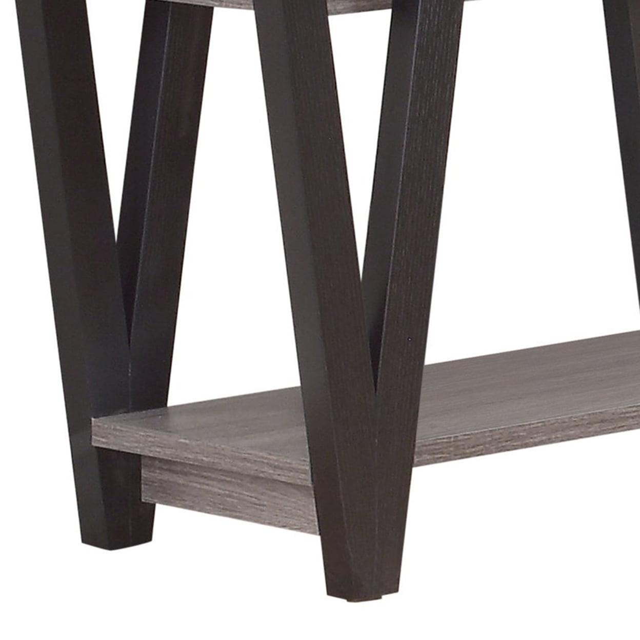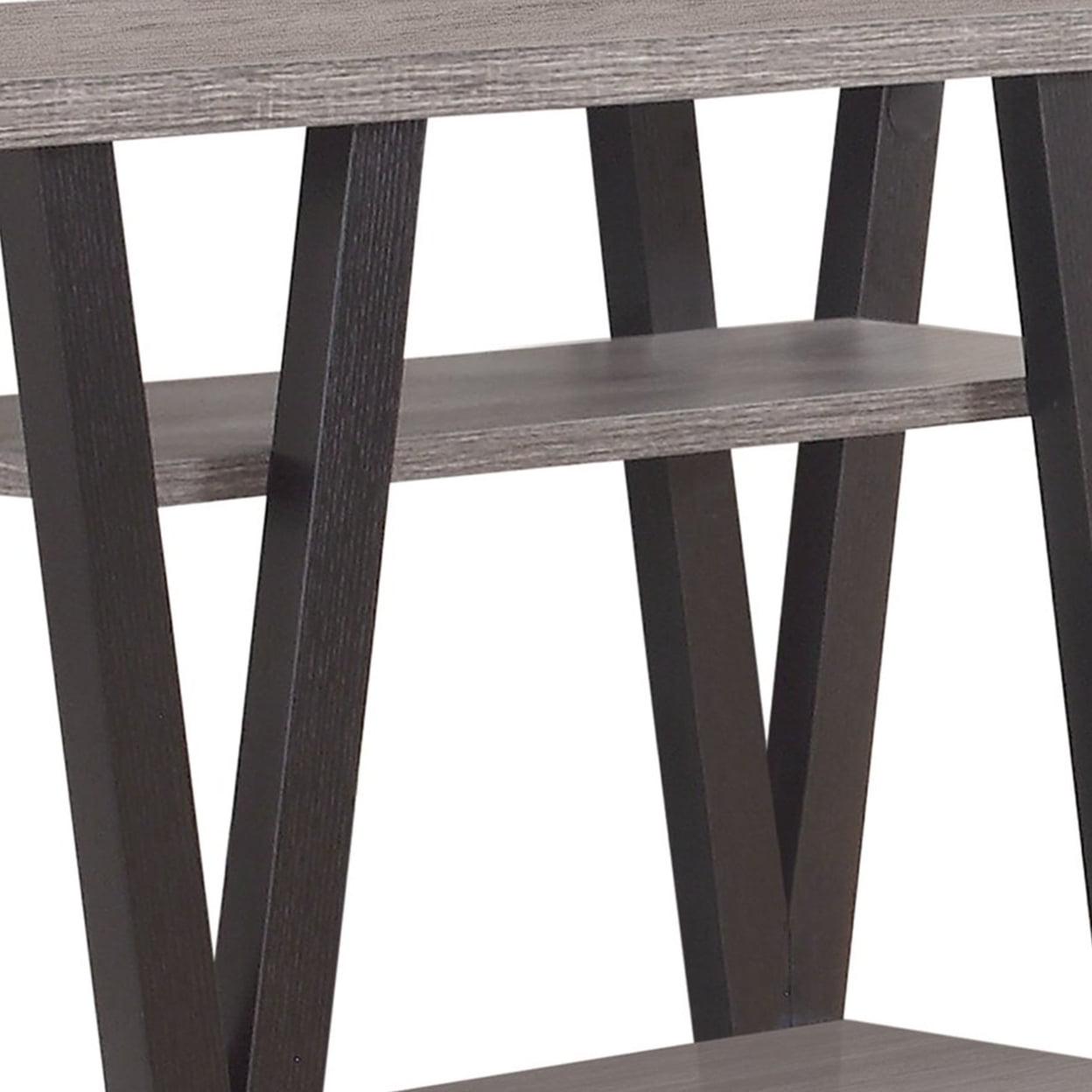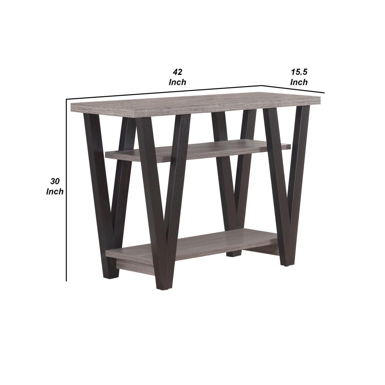 Zigzag Contemporary Solid Wooden Sofa Table With Bottom Shelves, Gray And Black- Saltoro Sherpi Lend your living area a retro look with this modish sofa table. Its rustic weathered gray finish lends antique mid-century charm to your interiors. Featuring an antique gray and black finish and an exceptional V patterned zig-zag base, this sofa table is the perfect addition for any living room to create slight transformation with visual appeal. It also renders two open bottom shelves for additional display or storage.