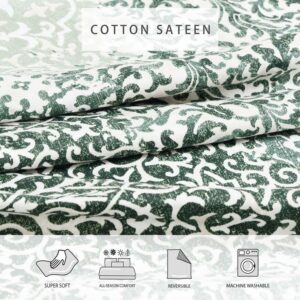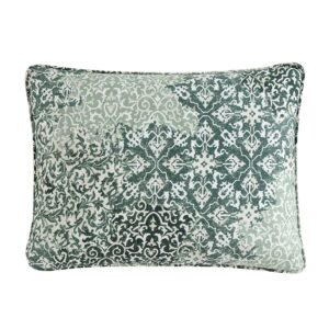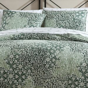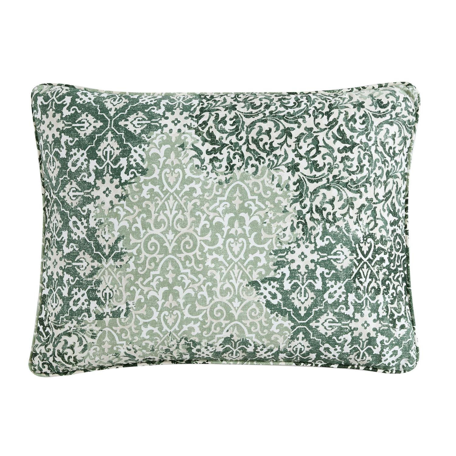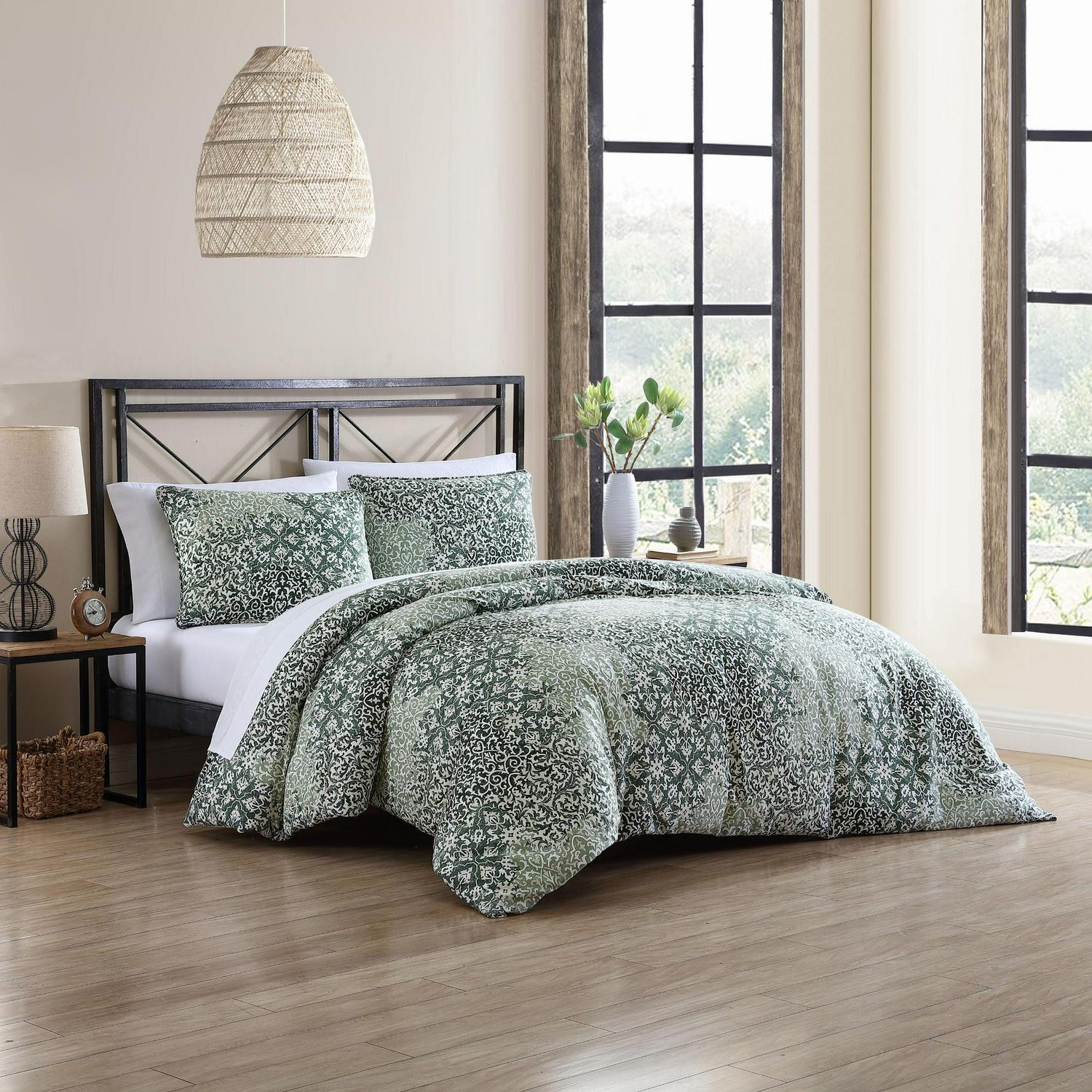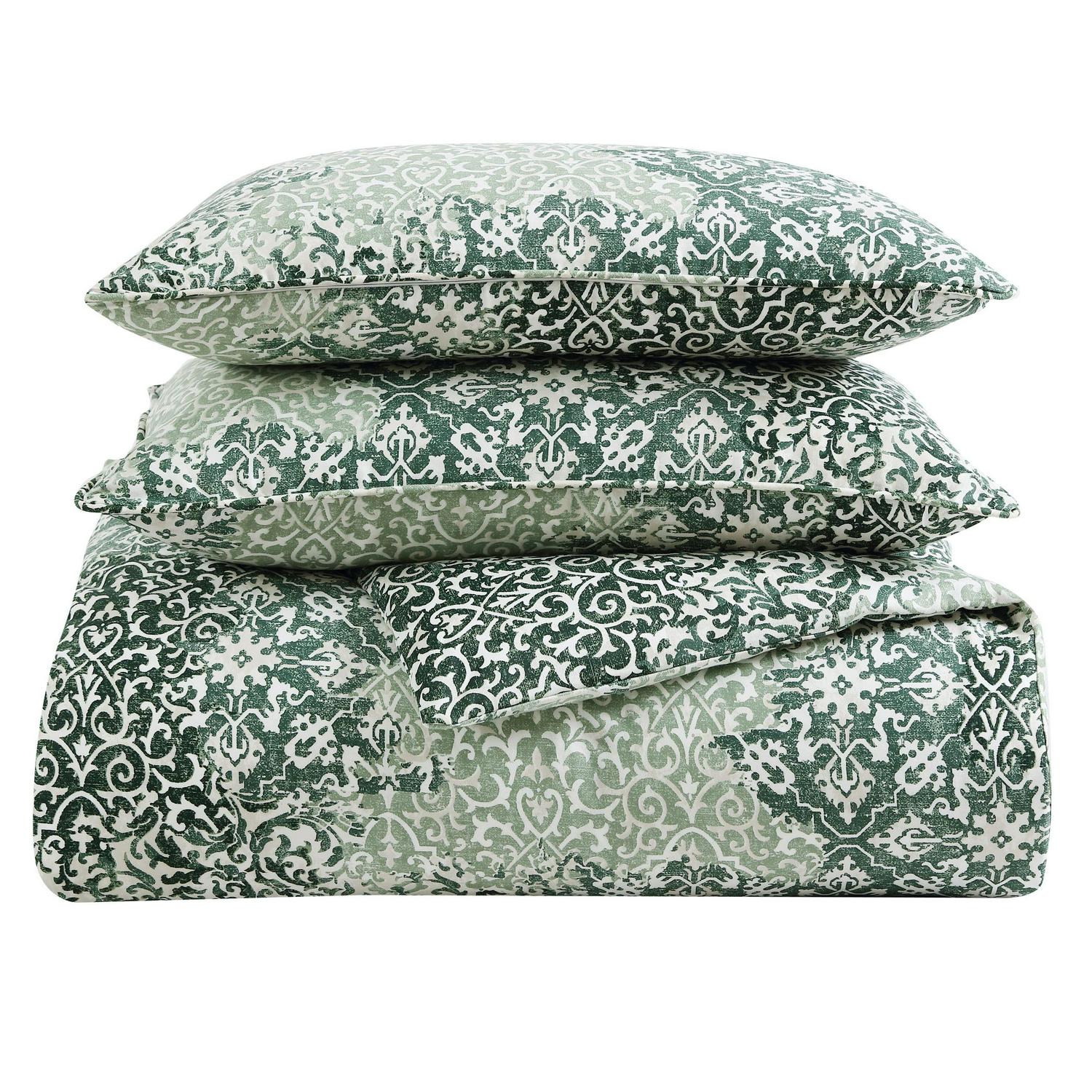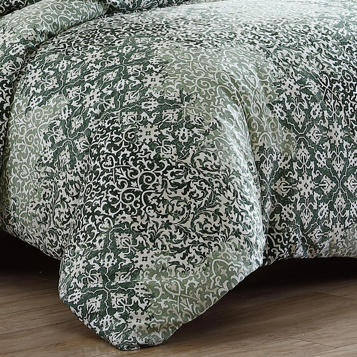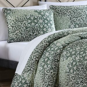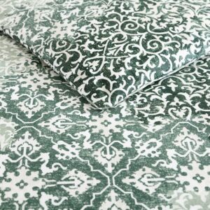 Ornamental design elements intersect and merge in a monochromatic mix of pattern and texture. This exuberant flow of pattern is muted and calmed by a minimal palette of mossy greens on a warm white cotton background. The overall textural effect is both serene and visually interesting and will add a unique, sophisticated look to your bedroom. Full/Queen Set Includes: One 96″L x 92″W Comforter and Two 20″L x 26″W Standard Shams. King Set Includes: One 96″L x 110″W Comforter and Two 20″L x 36″W King Shams.
