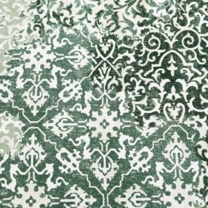 – Features a green ornamental design on a white ground
