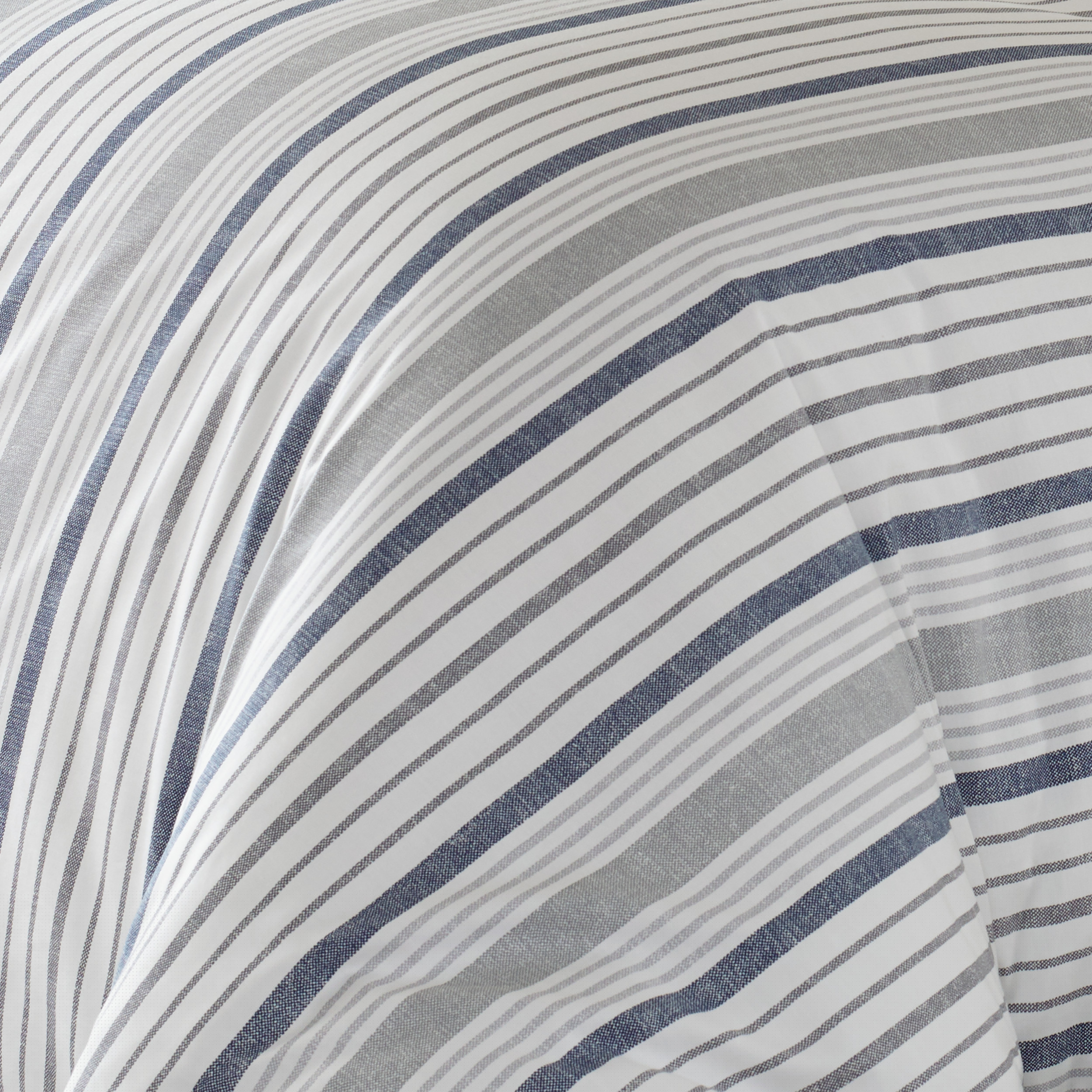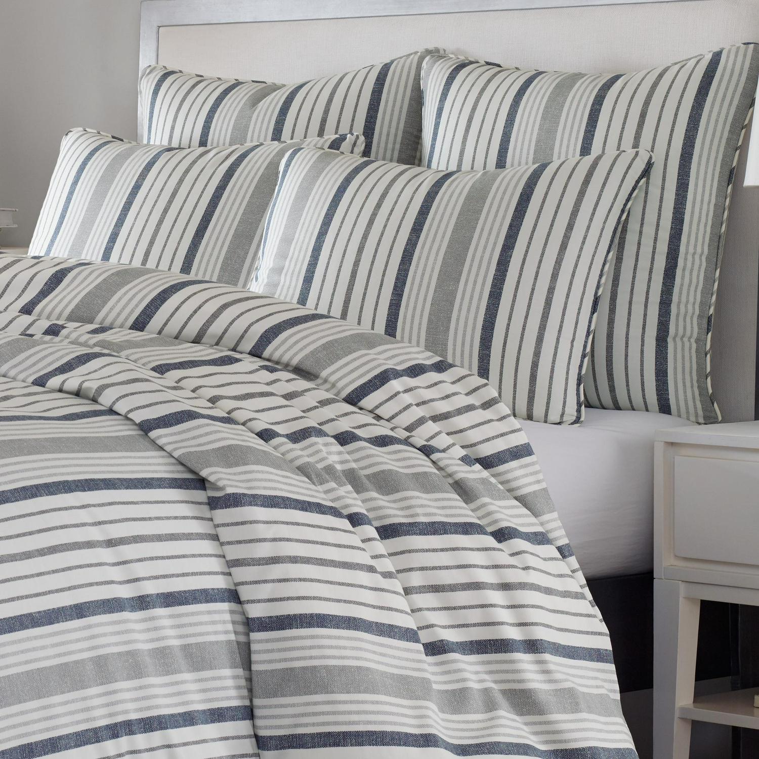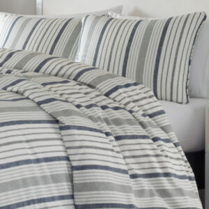 Timeless and always fresh, a Slate Blue and Gray on white shirting stripe is a simple and stylish update for any bedroom. Scaled up in size for a bigger impact, this casual stripe offers a relaxed and inviting look that is perfect for any season. Full/Queen Set Includes One 96″L x 92″W Comforter and Two 20″L x 26″W Standard Shams. King Set Includes One 96″L x 110″W Comforter and Two 20″L x 36″W King Shams.