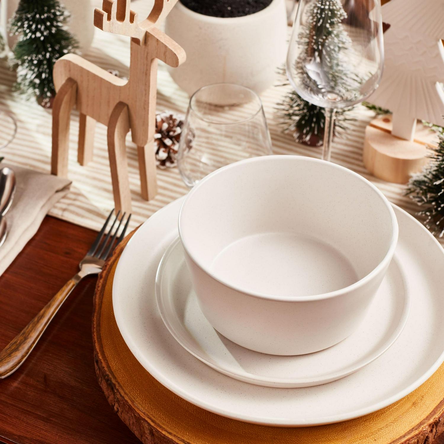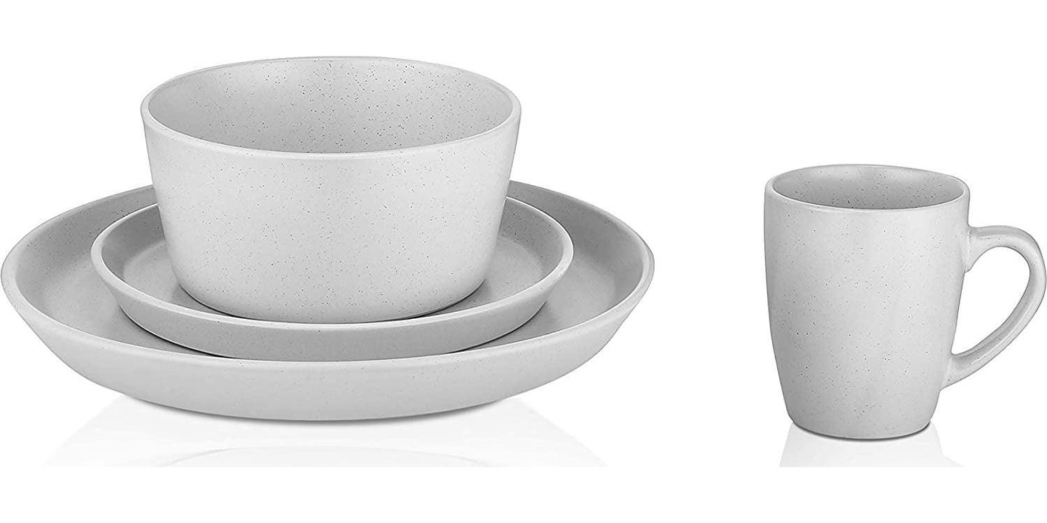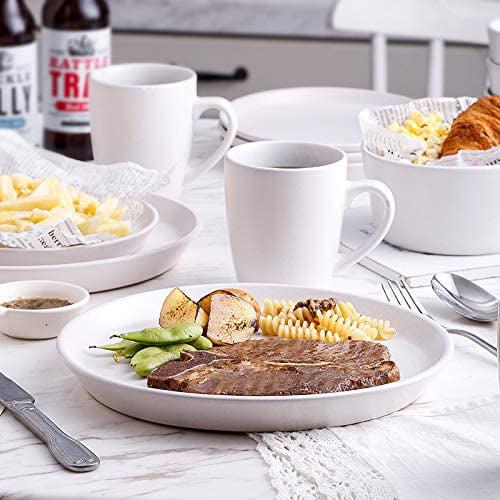 – EARTHY AND CLASSIC DESIGN – This modern speckled dinnerware collection features glazed crisp white plates, bowls and mugs. These beautiful place settings bring a natural and organic twist to your dishware, but is also basic enough to use for every day dining. Simply pair with your favorite cutlery and silverware and you are ready to eat!