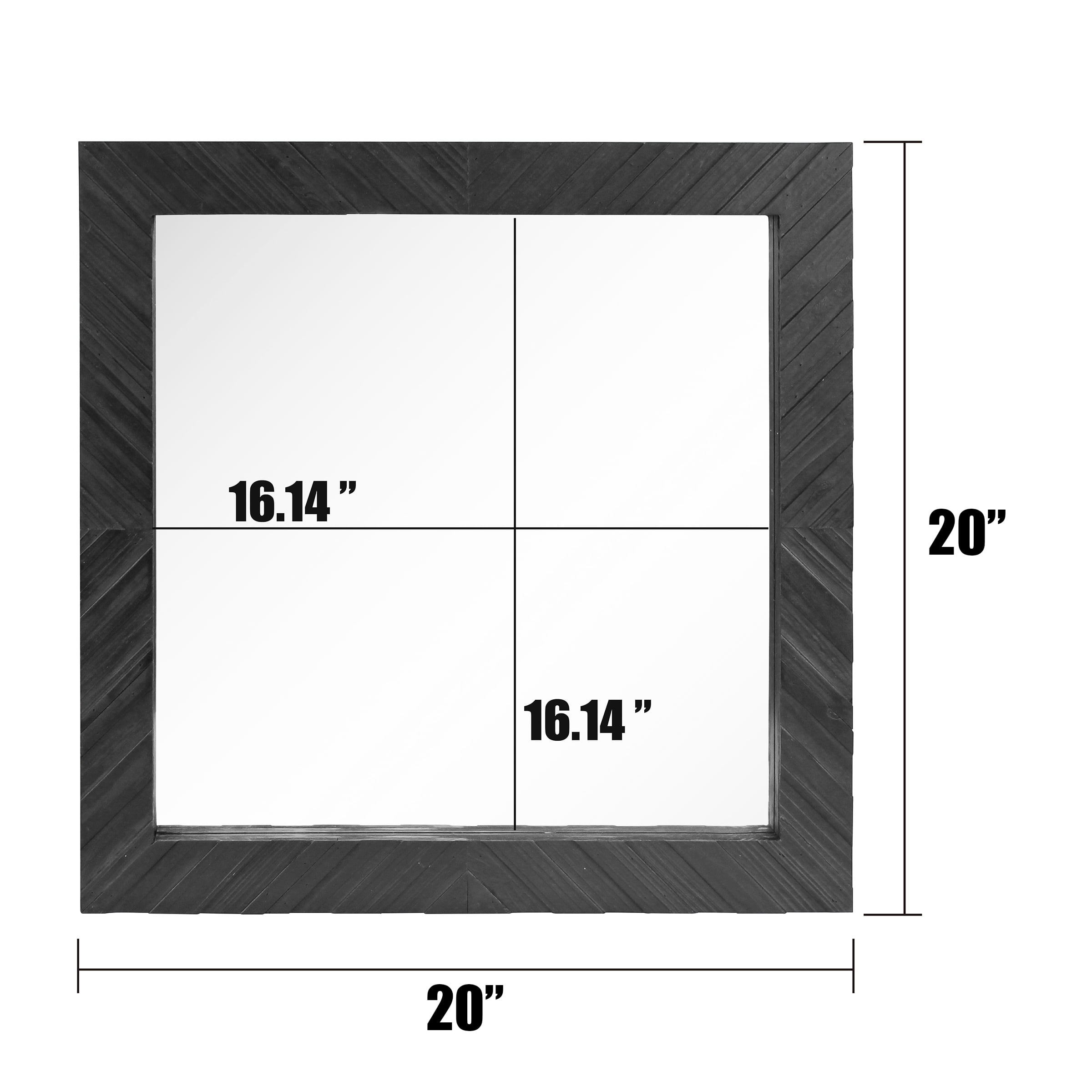 Stonebriar 20″ x 20″ Black Modern Square Wood Chevron Wall Mirror: Wood frame measures 20″H x 20″W x 1.1″D Glass mirror alone measures 16.1″ x 16.1″ Wooden chevron frame Black painted finish Vertical orientation Wall mounted display Come with two attached sawtooth hangers