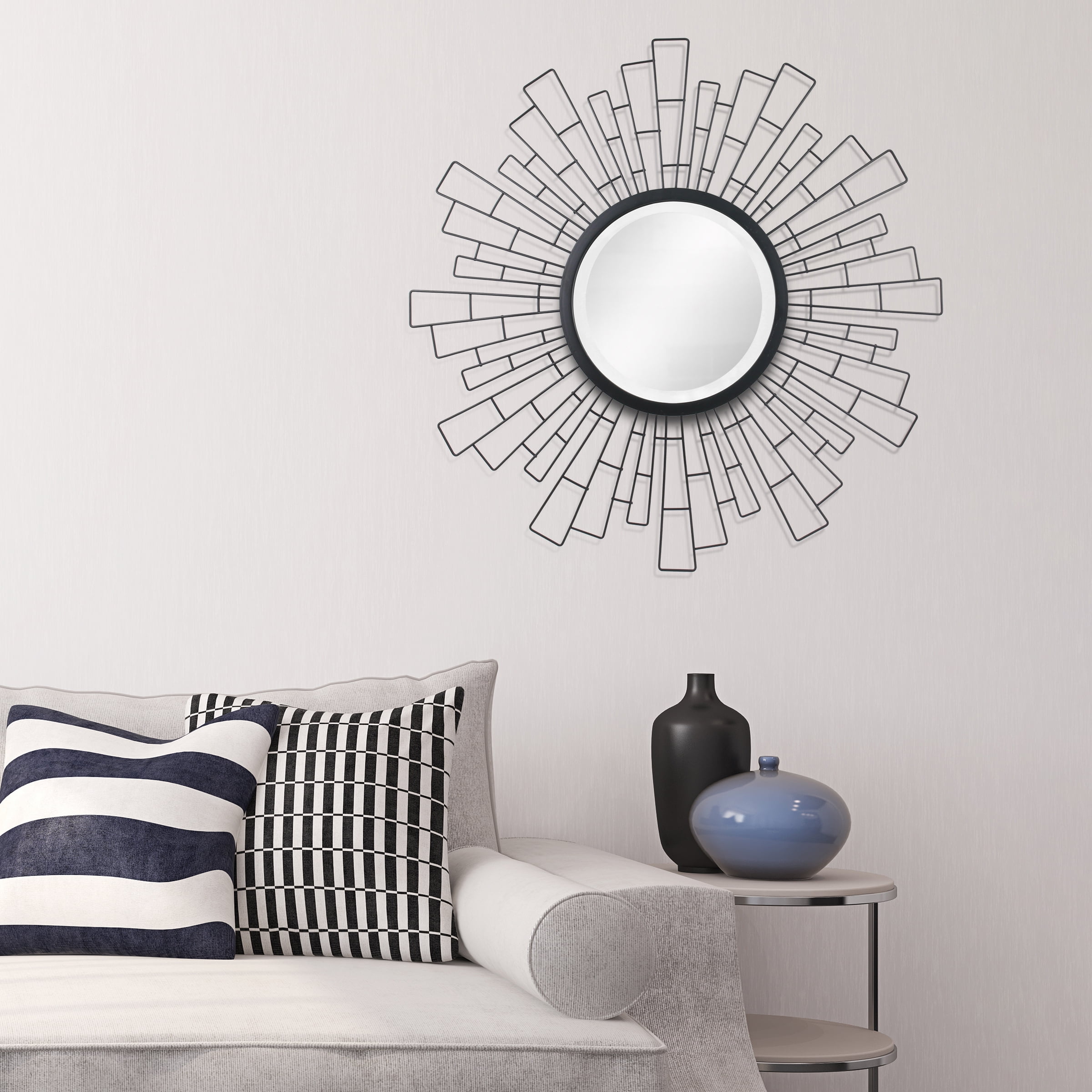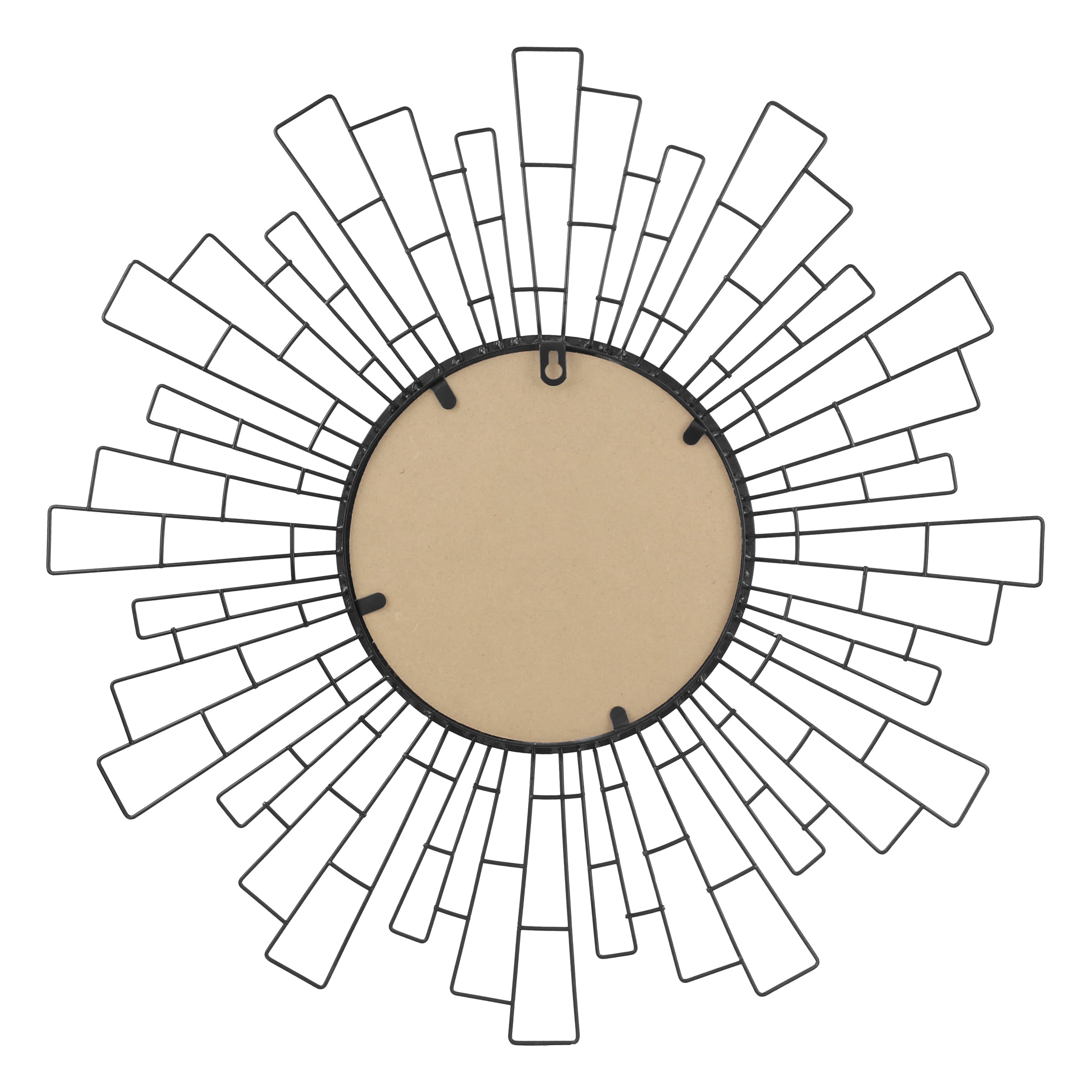 Stonebriar 23.6″ Black Traditional Metal Geometric Sunburst Wall Mirror: Measures 23.6″ in diameter Glass mirror alone measures 8.8″ in diameter Wire metal geometric sunburst frame Black painted finish Wall mounted display Comes with attached keyhole hanger