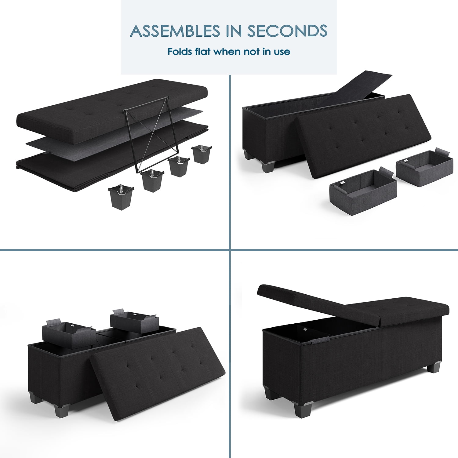 StorageBud Linen Ottoman Storage Bench, 43″ Bench, Black The StorageBud tufted storage ottoman bench serves as a coffee table ottoman for living room or fall decor. This ottoman with storage is a perfect choice to help you make the most of your living space by acting as both a storage container and a comfortable ottoman or even a footrest. Our storage ottoman can fold flat when not in use, adapting the ottoman to suit your storage needs and when in need of additional seating. The durable Linen, black ottoman helps organize essentials and accessories with this multipurpose storage bench. Our ottoman’s sturdy, cushioned lid for bedroom storage is comfortable and supportive. It has an invisible hinge design that allows it to be bent and lifted up from either side without removing the entire lid. The sizeable ottoman space stores bulkier items like throw blankets and pillows. Our 43-inch Hinged Storage Ottoman Bench Features: The bench has a classic appearance that could match most styles of house Hearth and Harbor Storage Ottoman helps to alleviate storage shortages in your home permanently Use to store blankets, pillows, books, toys, accessories, games and more Adjust the height by adding or removing sturdy legs Folding Foot Rest Ottoman with Storage for Living Room It includes 2 removable bins to keep small, loose items out of sight, neatly organized and easily accessible Our Bench is a great decor and organizer with ample storage space for your belongings and clutter Transforms your space and reduces clutter Easy Assembly Required