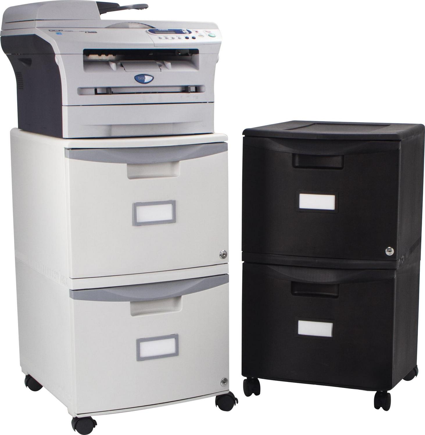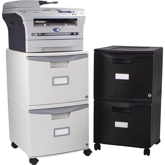 – Lightweight plastic file cabinet; affordable alternative to metal