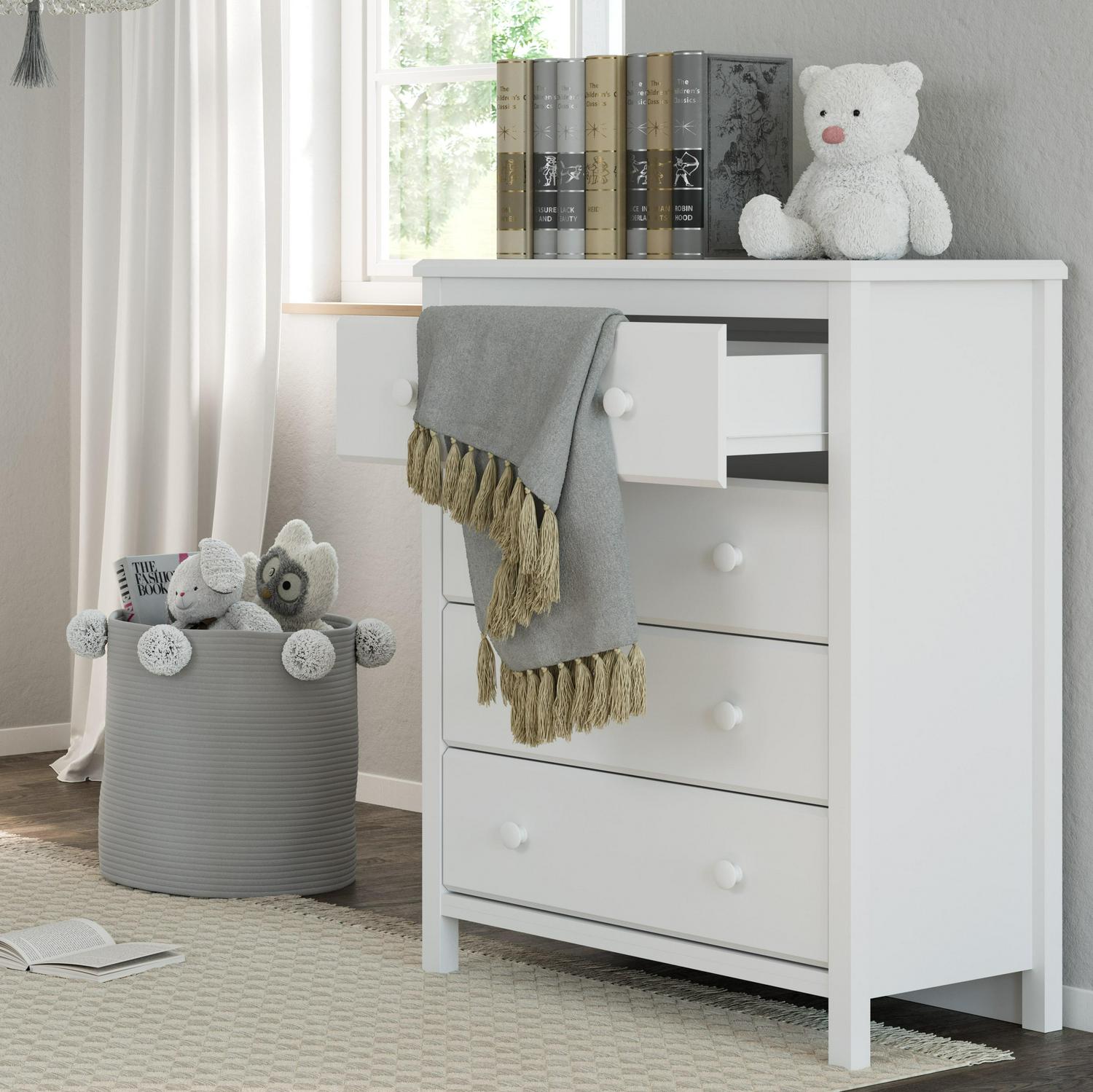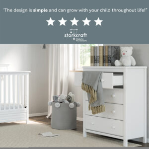 – MODERN, STYLISH 4-DRAWER DRESSER: This 4-drawer dresser offers families a modern storage solution that is easy to match with any style of nursery or kids bedroom