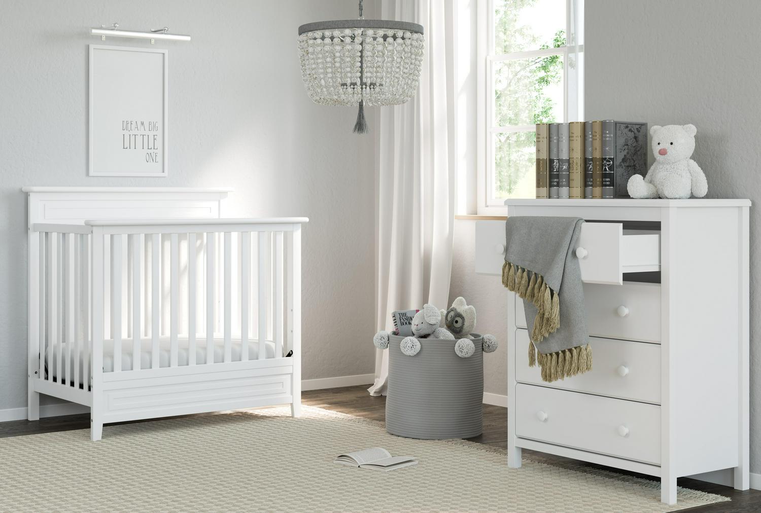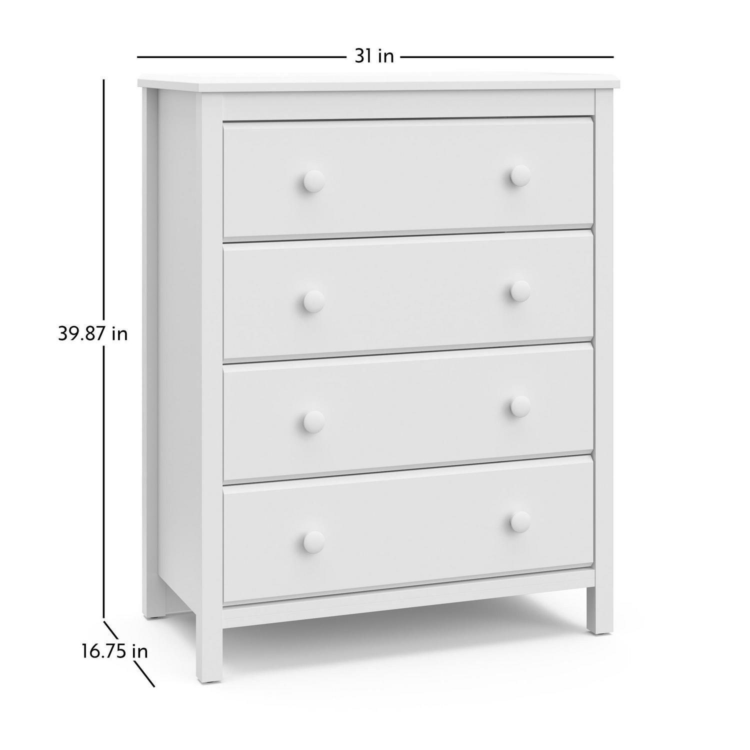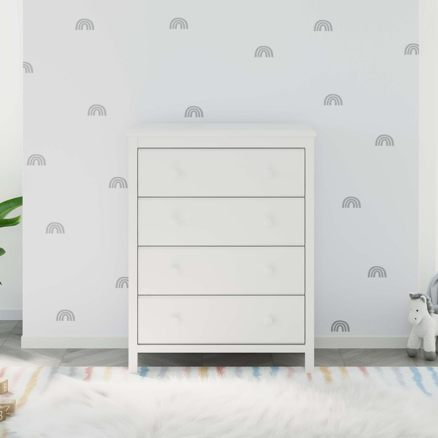 The Storkcraft Alpine 4-Drawer Dresser is a modern, universal storage solution matches any style of nursery or bedroom. With clean lines and sturdy construction, the Alpine is a reliable storage solution. Also, this vertical dresser features durable steel hardware and Euro-glide drawers with safety stops. Backed by Storkcraft’s 1-year limited warranty and supportive customer care. Complete the collection with the matching 2-Drawer Changing Dresser, Changing Table, and 4-in-1 Convertible Crib. Exclusively from Storkcraft, proud recipient of the 2022 Women’s Choice Award for 9 out of 10 Customer Recommended Baby and Kids furniture. Available in White, Espresso, Pebble Gray, and Gray.